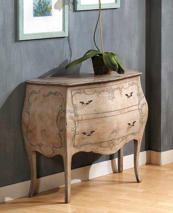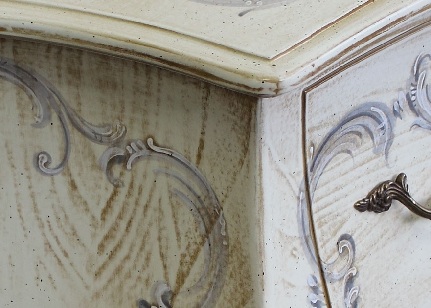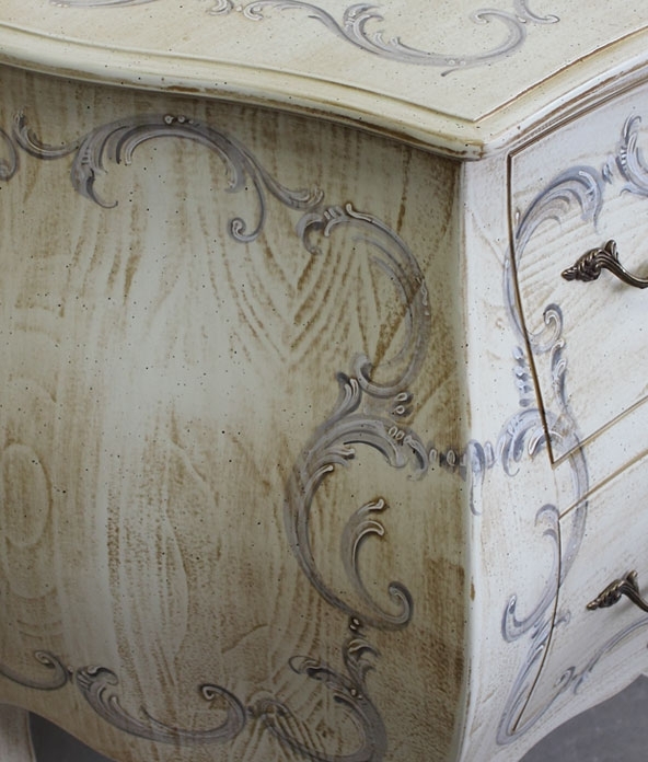Comò bombato dalla raffinata finitura grazie ad una laccatura avorio antico e un delicato decoro.