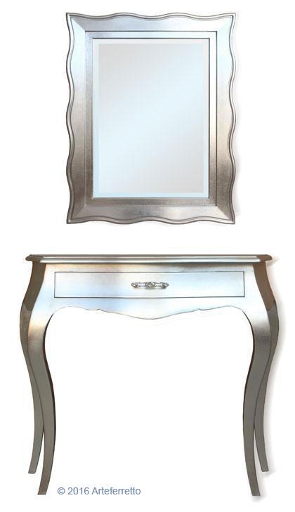 Consolle ingresso consolle e specchio in stile classico ma ben si adatta anche ad ambienti in stile contemporaneo grazie alla foglia argento lucido.