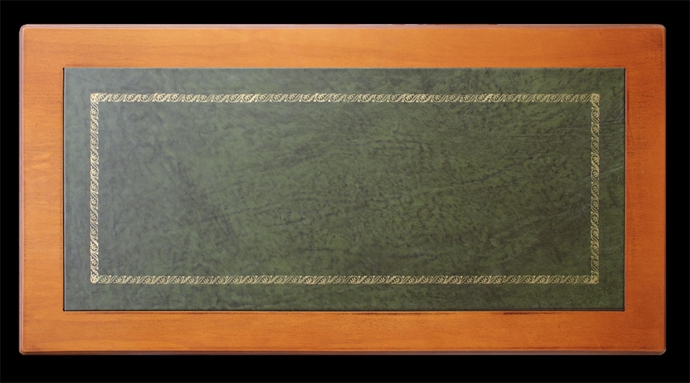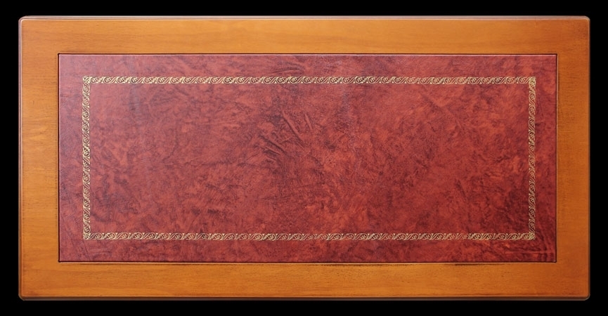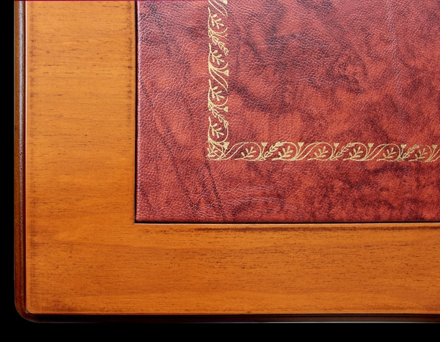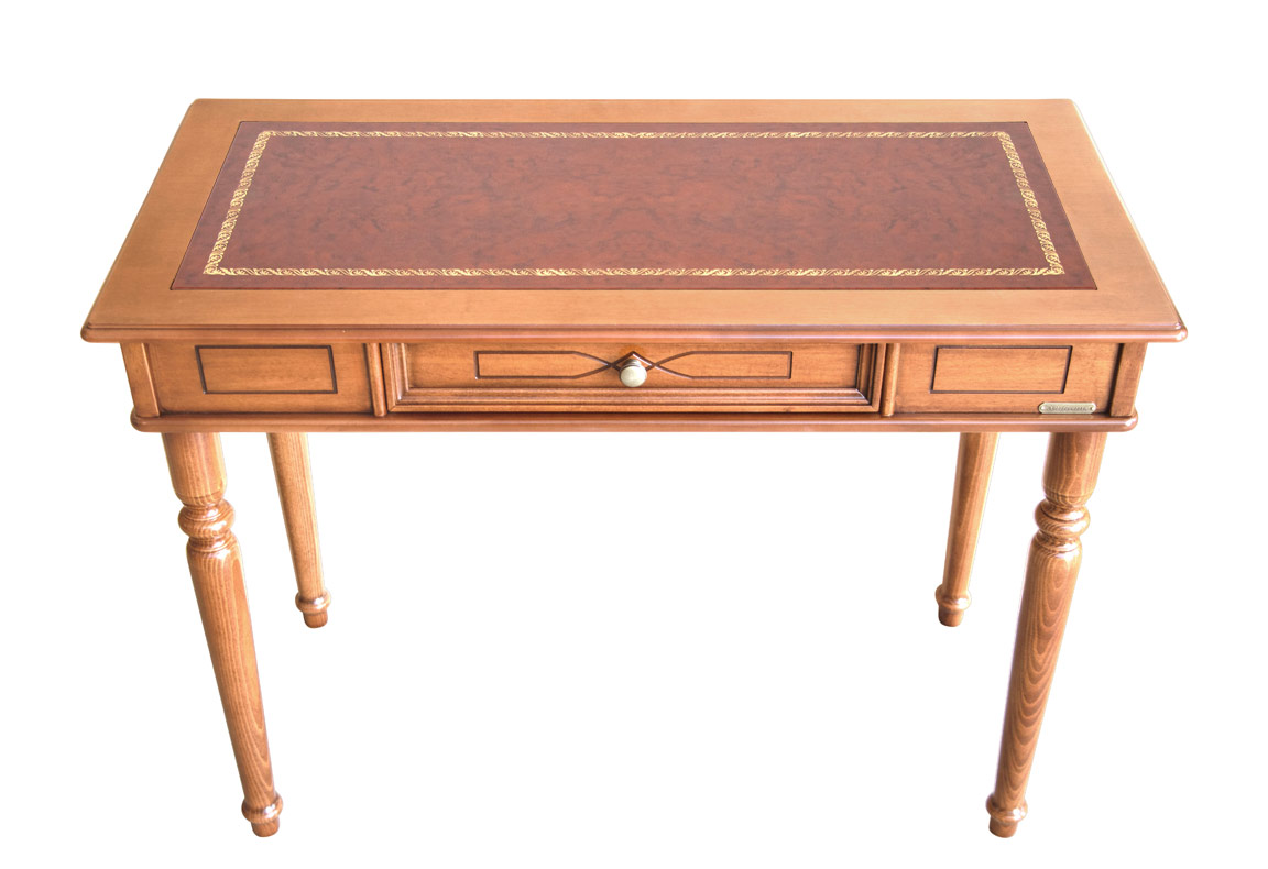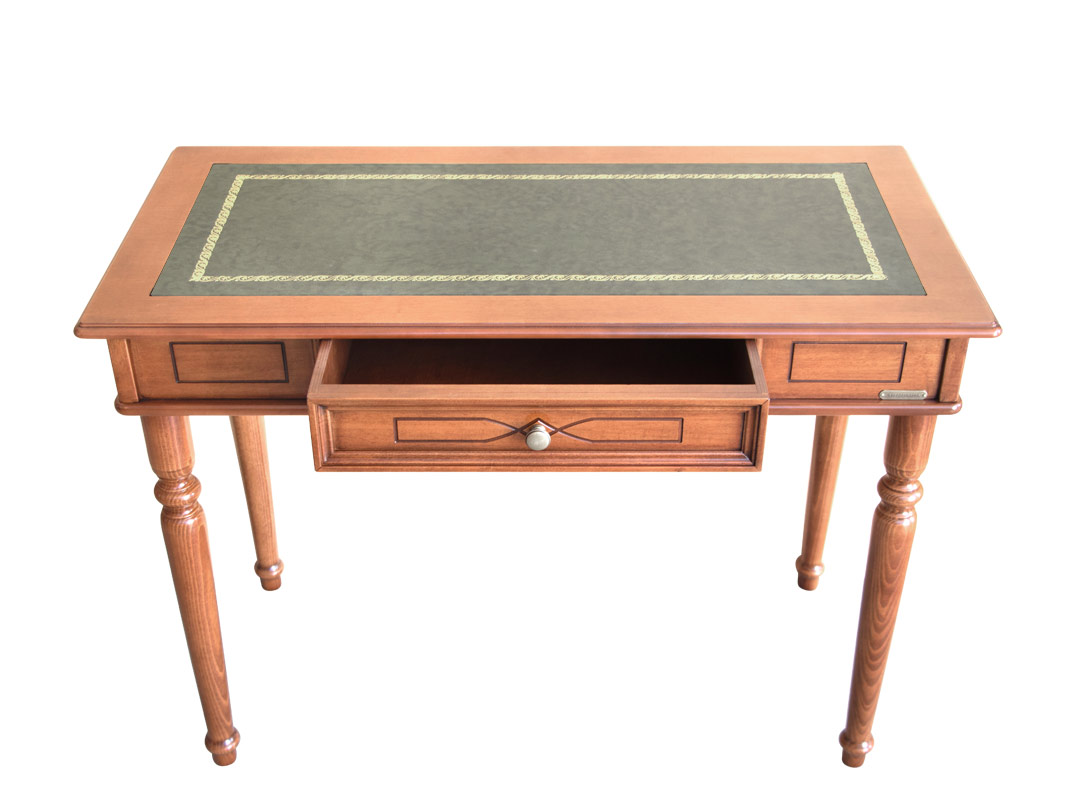 Le lavorazioni con incisione, presenti su tutti i lati, donano eleganza e raffinatezza a questo scrittoio. Il top, valorizzato da un piano in pelle con fregio dorato, rende questo funzionale scrittoio un elemento d'arredo unico.