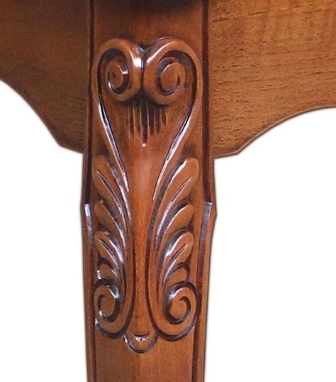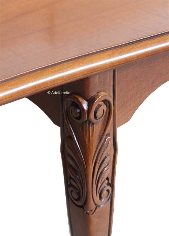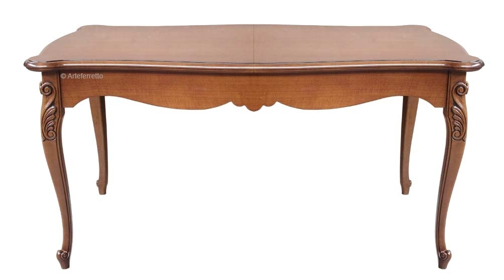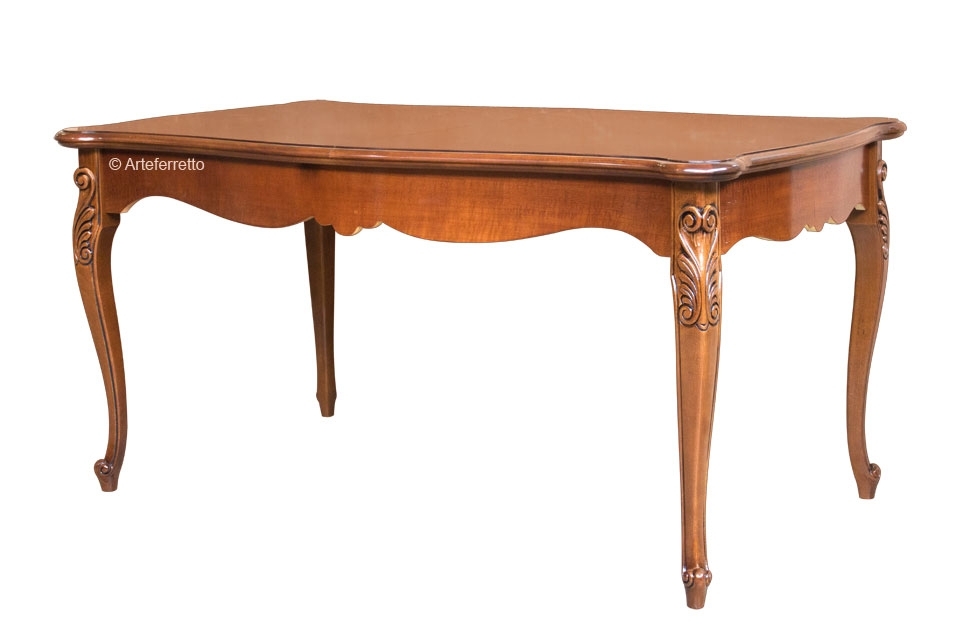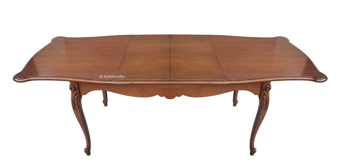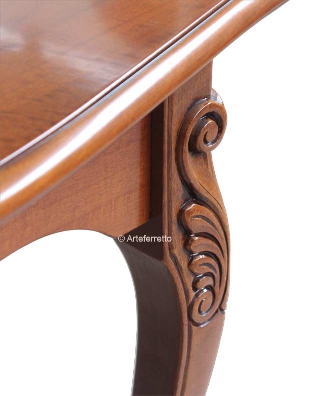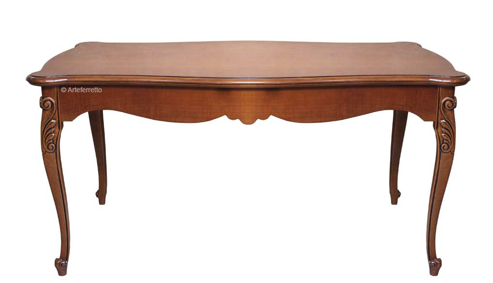 Lo distingue da un comune tavolo la piacevole sagomatura del bordo, dolcemente curva, che si accompagna in un perfetto abbinamento ai fianchi e le belle e solide gambe piacevolmente intagliate. Il piano e il basamento del tavolo sono in multistrati di noce, le gambe sono invece in faggio.