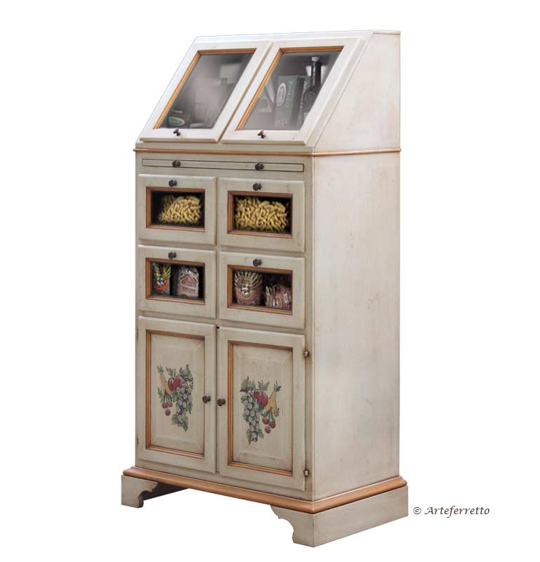 Laccatura avorio anticato con decoro sulle porte e filo ocra.Il tagliere è volutamente non laccato per il corretto utilizzo in cucina.