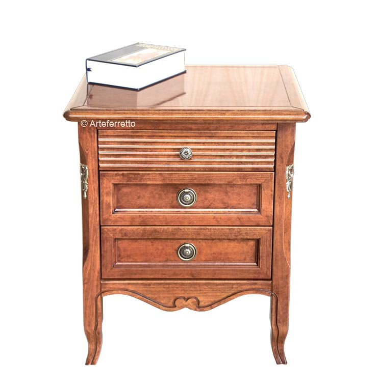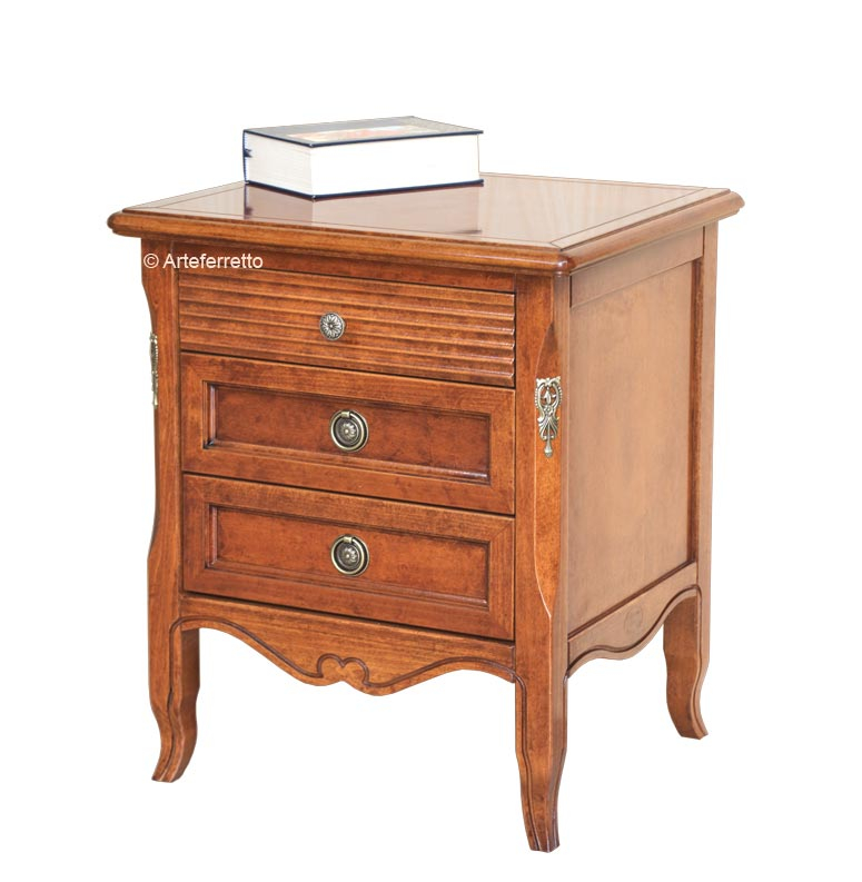 Comodino massello con solida struttura, molto ben lavorato. Curato nei minimi dettagli, offre la comodità di tre ampi cassetti con chiusura controllata grazie ad un efficace meccanismo posto sul fondo di legno massello dei cassetti.