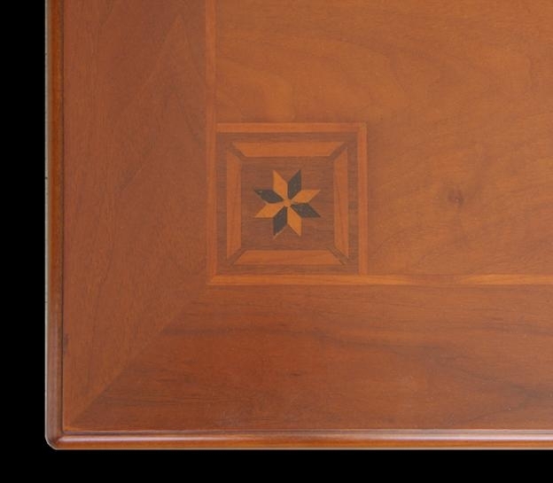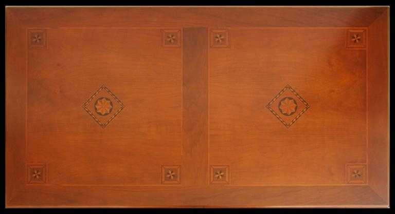 Abbina ad una struttura decisamente robusta, un raffinato gioco di intarsi che ne caratterizzano il piano.