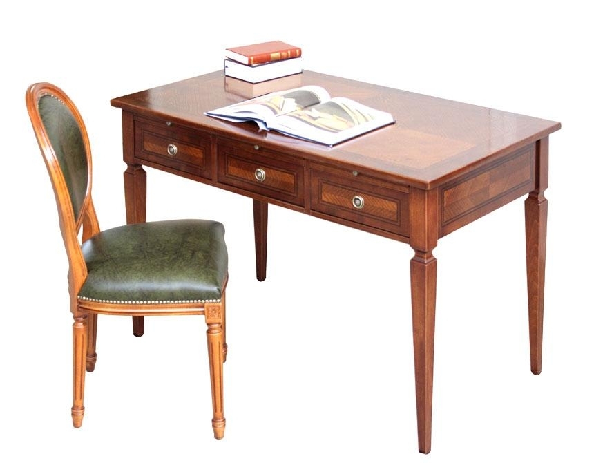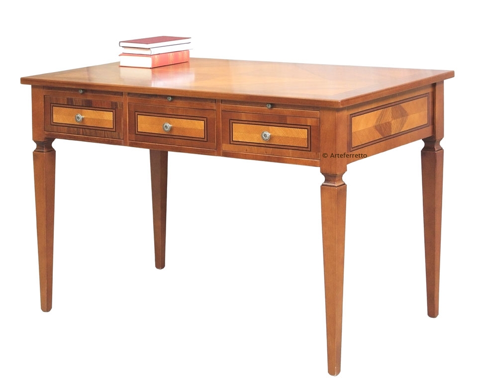 Uno scrittoio 3 cassetti classico dalle linee molto semplici, la cui particolarità risiede quasi esclusivamente nella funzionalità dei capienti cassetti e dei tiretti che contribuiscono ad aumentare lo spazio di appoggio disponibile, permettendo se necessario anche l'alloggiamento di un eventuale moderna tastiera per pc.