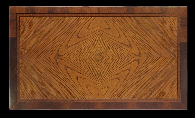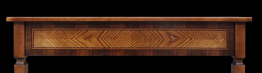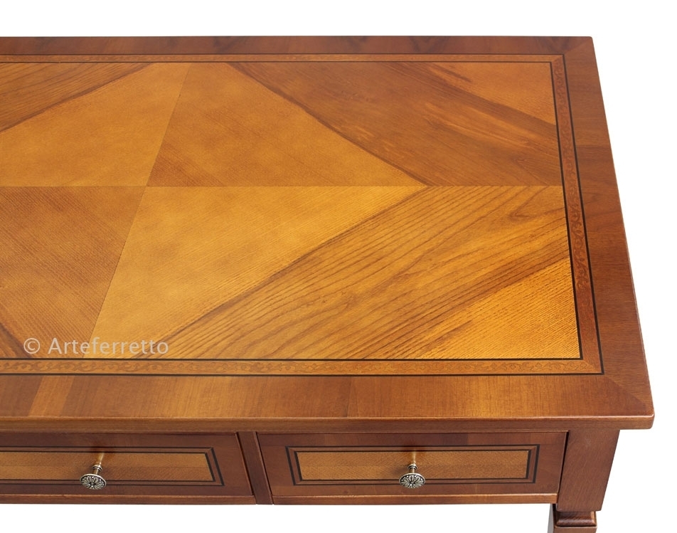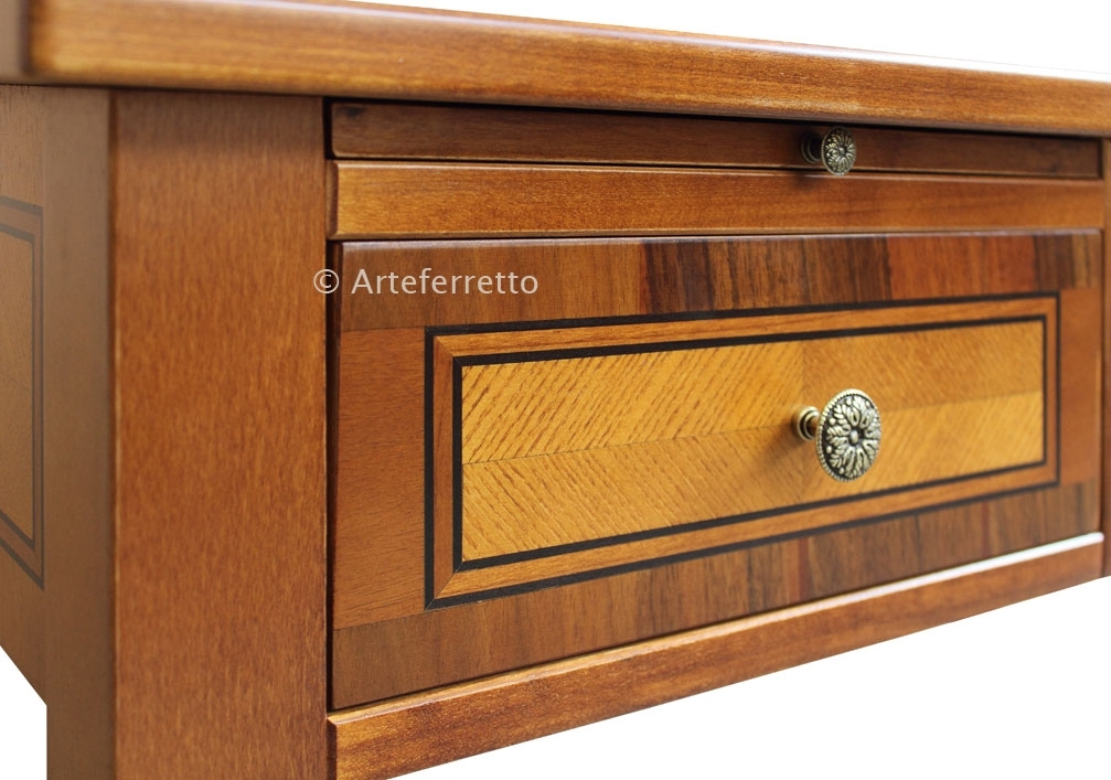 Le venature del legno massello sul piano di lavoro, come l'intarsio della facciata dei cassetti, sono ben visibili ma discreti, quindi in perfetta armonia con la sobria struttura dello scrittoio.