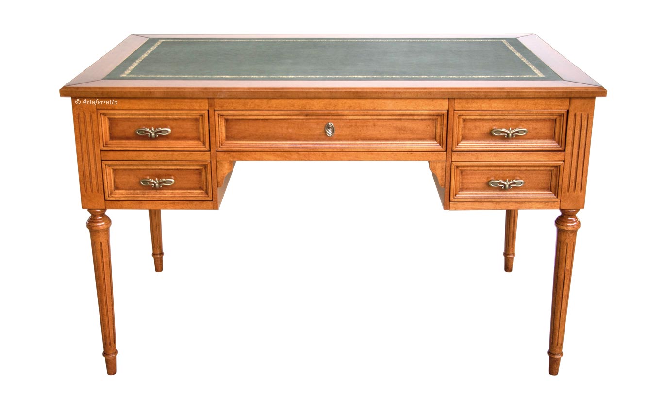 Arredo di stile classico caratterizzato dalla elegante lavorazione del legno e al piano con vera pelle, che conferiscono al mobile classico importanza e raffinatezza. Queste caratteristiche però, celano un fondamentale aspetto di funzionalità dello scrittoio, dato dai 5 capienti cassetti.