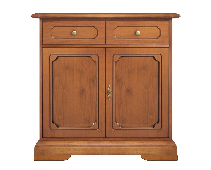 Splendida credenza in stile che abbina ad un comodo cassetto a doppia facciata (sembra che i cassetti siano due, ma si tratta di un unico elemento) due splendide antine lavorate con una elegante pantografatura a ricavare un disegno classicamente intrigante.