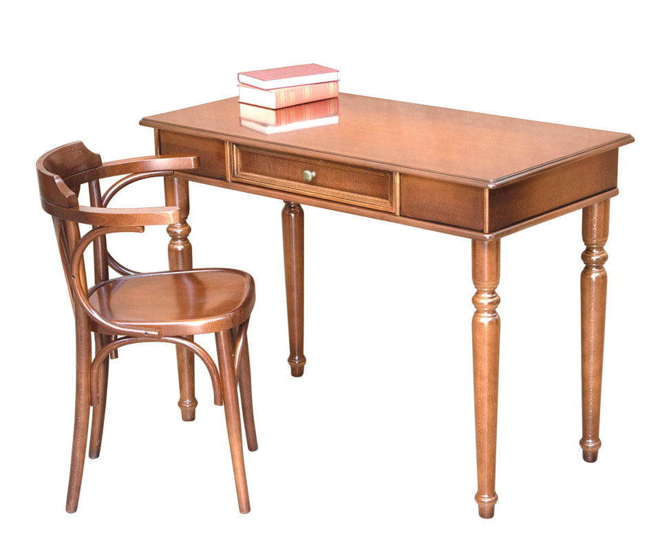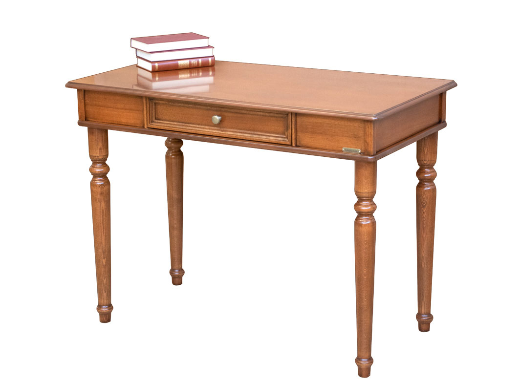 Struttura in legno massello di faggio; piano di appoggio e cassetto realizzati in pannelli di mdf ricoperti da legno naturale noce tanganica.