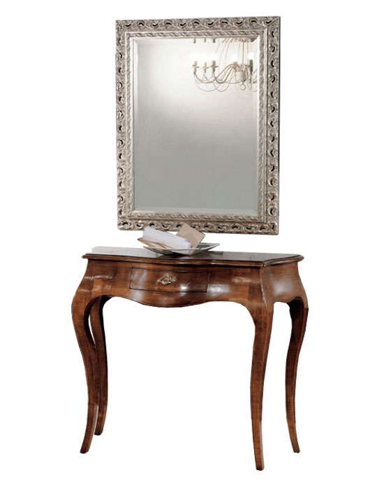Elegante soluzione per ingresso con una consolle di grande raffinatezza stilistica, unita ad un elemento specchiera impreziosita da una classica lavorazione esaltata dalla finitura in foglia d'argento.