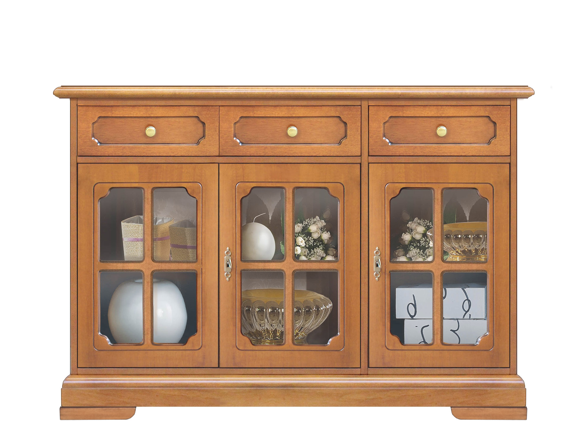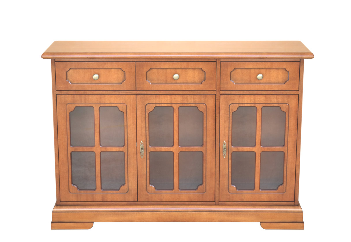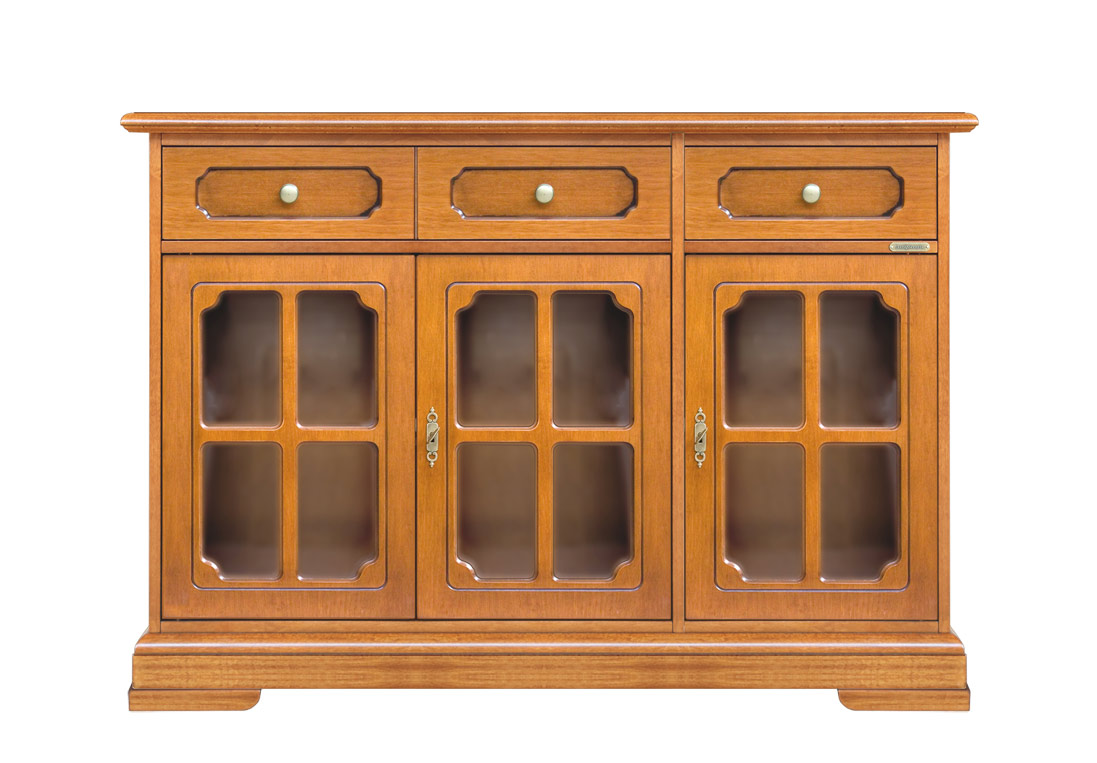 Una credenza di forma classica che presenta tre antine caratterizzate da una lavorazione pantografata su corpo unico a ricavare una elegante griglia a protezione del vetro che caratterizza il corpo dell'anta.