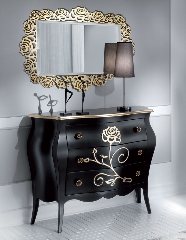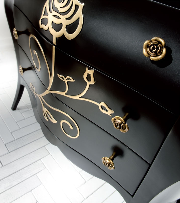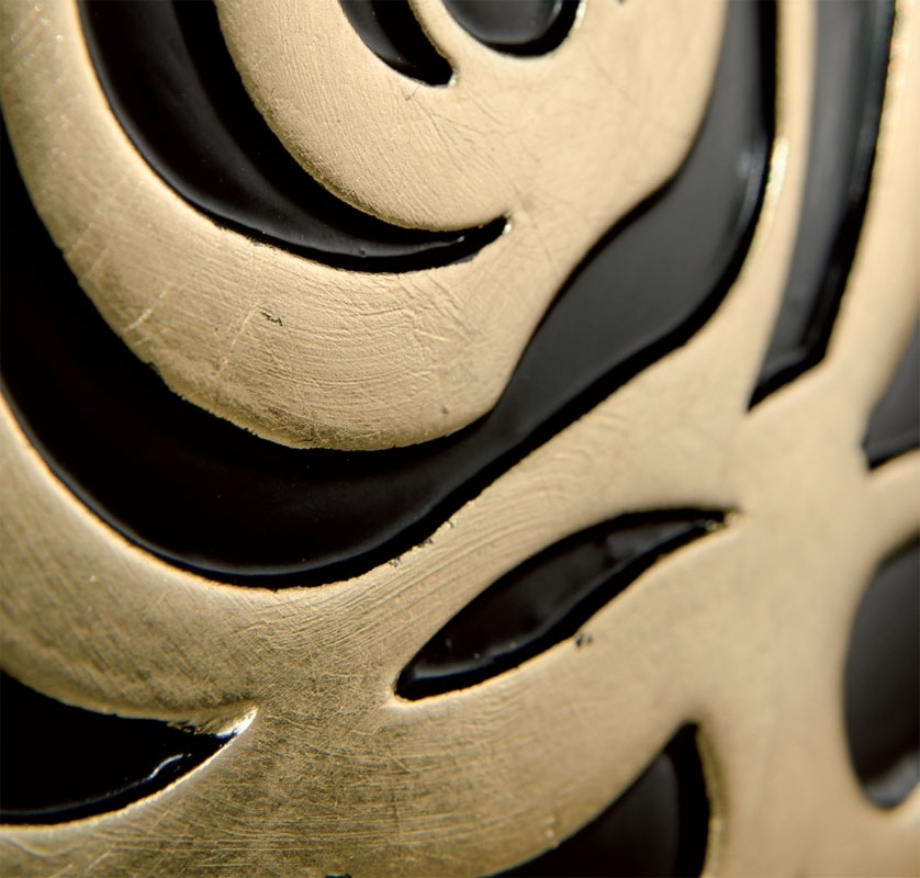 l'accostamento tra foglia oro e tinta nera, crea un abbinamento che colpisce nel segno e mette in risalto tutto lo splendore del mobile.