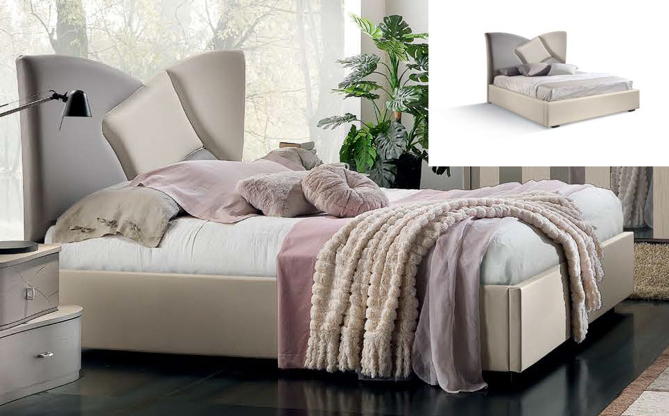 Letto matrimoniale dal design moderno, presenta una confortevole imbottitura sulla testiera e lungo il giroletto, con rivestimento in eco- pelle.