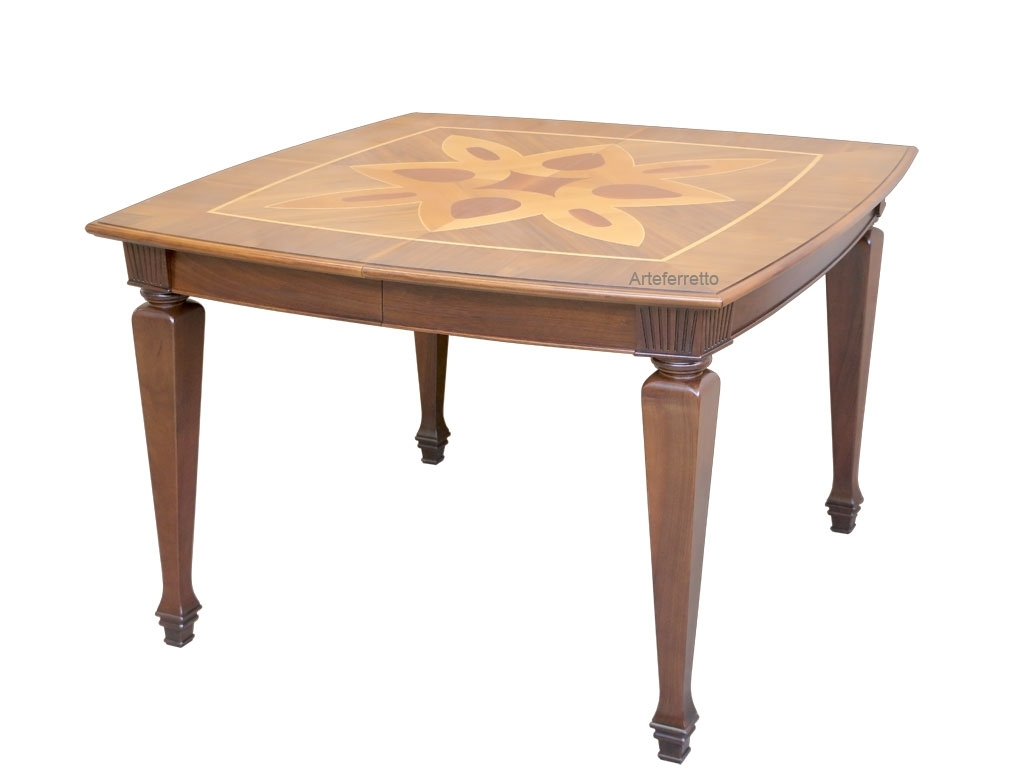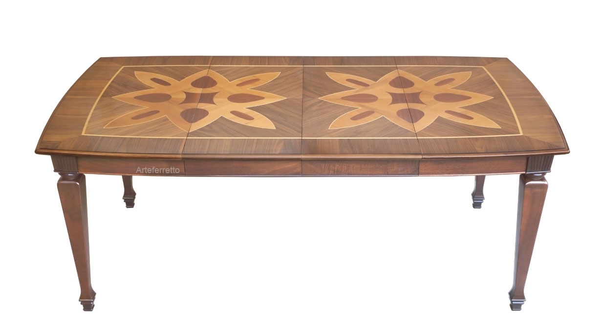 Nella configurazione chiusa il tavolo presenta un piano quadrato con lato di 120 cm. Allungato mantiene tutta la sua stabilità e, grazie alle allunghe a libro posizionate sotto il piano, mantiene la forma completa dell’intarsio raddoppiando il bel motivo riprodotto.
