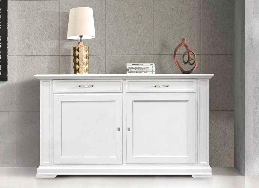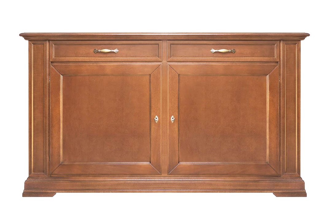 La sua è una struttura che ricalca la tradizionale conformazione della credenza. Porte nella parte inferiore e cassetti appena sotto il top. Il tutto stilizzato da discrete cornici in legno a modellarne la linea.