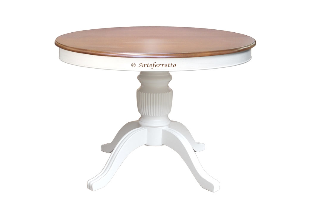 Raffinato tavolo bicolore rotondo, sintesi di stile ed eleganza. Nella configurazione bicolore esalta il piano in legno naturale di noce tanganica abbinato alla laccatura preferita per la parte strutturale.