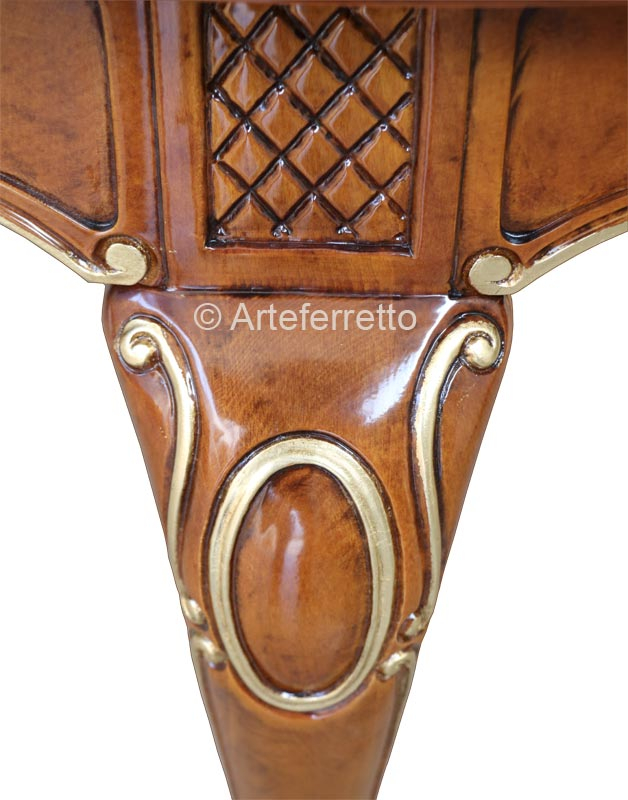 Valorizzati dalla splendente foglia oro, spiccano con eleganza sulla calda tonalità del legno particolari lavorazioni che modellano con stile il legno. Dettagli raffinati e minuziosi, che trasmettono l'evidente valore e tipica raffinatezza dello stile classico.