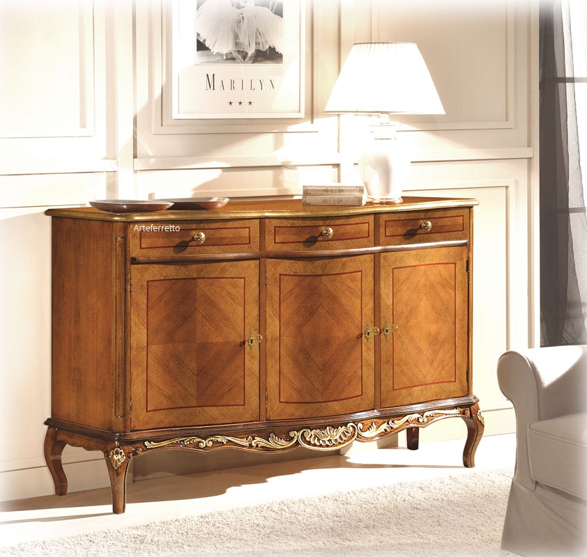 Credenza intarsiata con 3 ante e 3 cassetti. Le sue dimensioni e l'equilibrata suddivisione dello spazio la rendono capiente e pratica per ogni necessità.