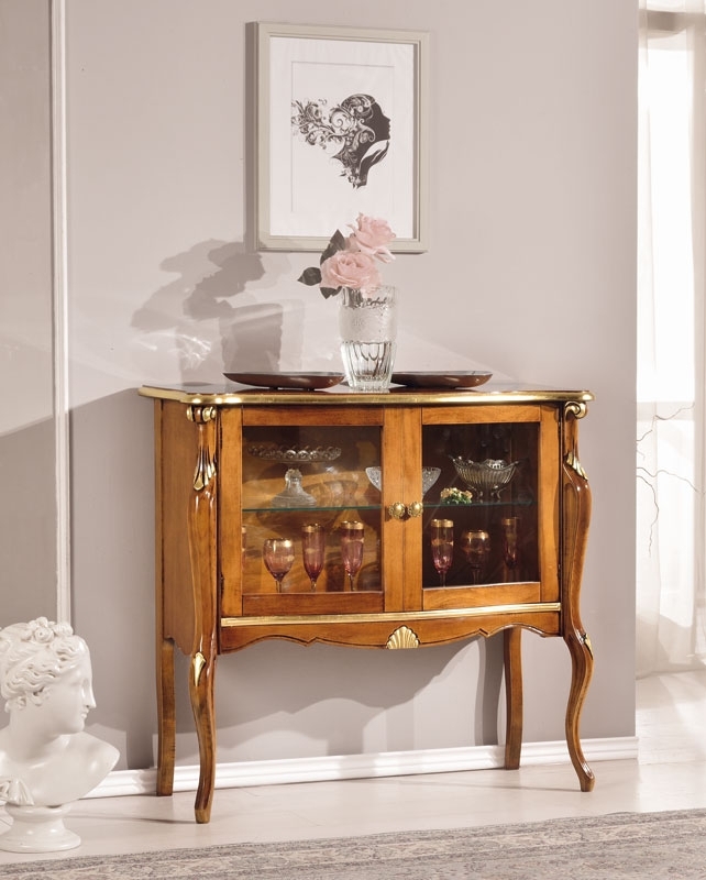 l'inconfondibile qualità del lavoro artigianale si rispecchia lungo spalle finemente modellate che, proseguendo nello sviluppo delle gambe, contribuiscono a dare slancio alla parte superiore del mobile. Il piano e le particolari lavorazioni di intaglio sono valorizzate dalla finitura in foglia oro che donano luminosità a questa splendida vetrinetta, mentre la patinatura lascia emergere le ammirevoli sfumature del legno.