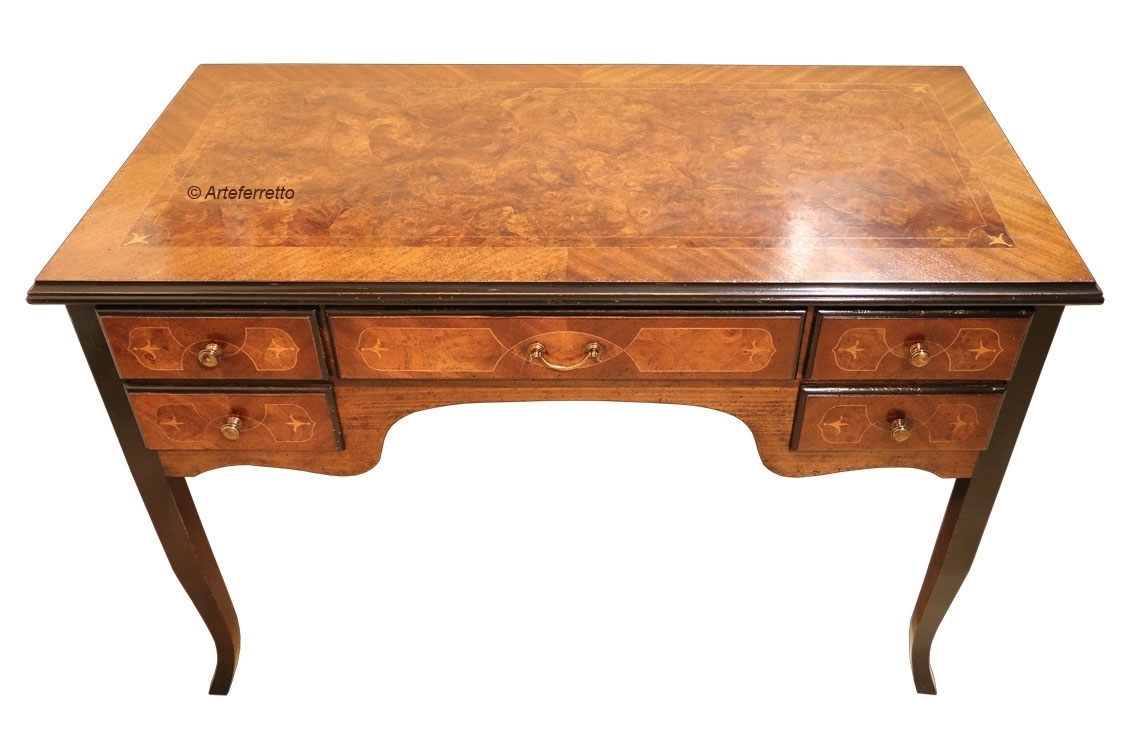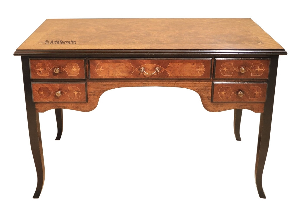 La linea è quella dello scrittoio classico, con cassetto largo centrale e coppia di cassetti più stretti lateralmente.