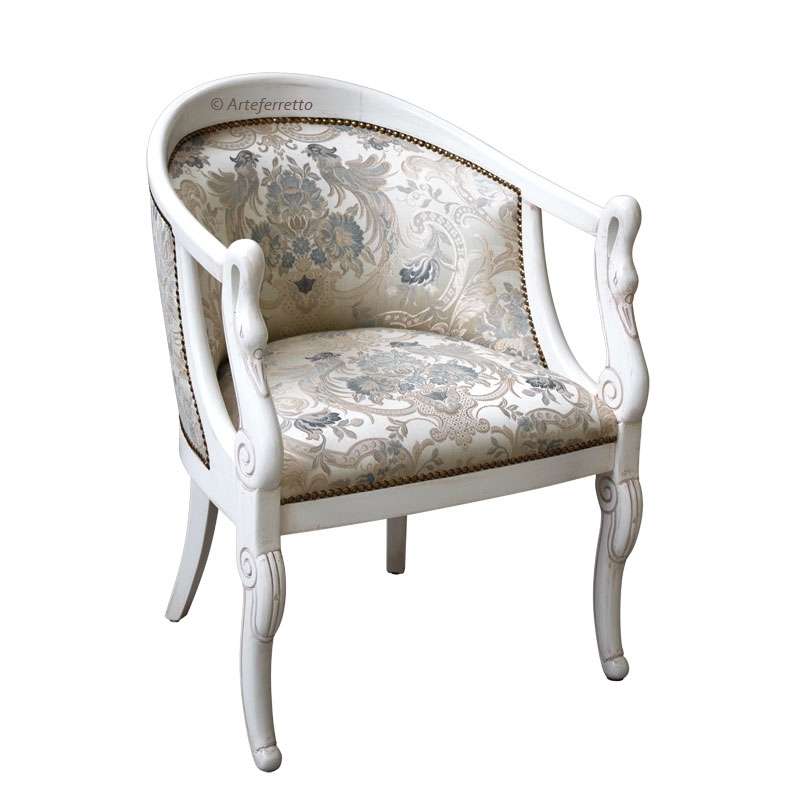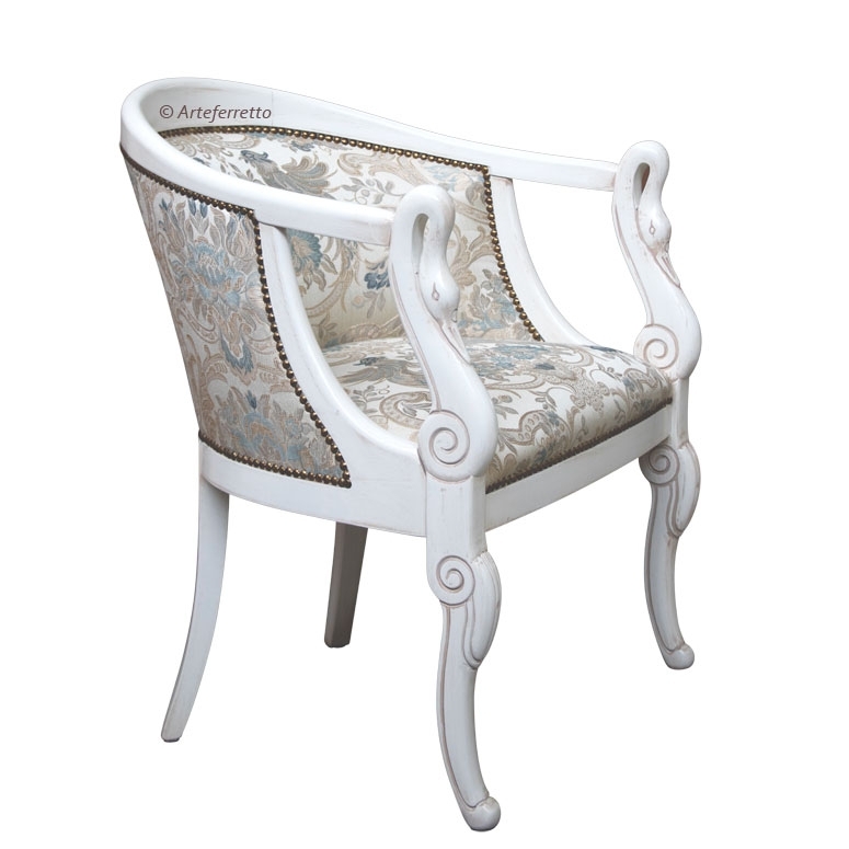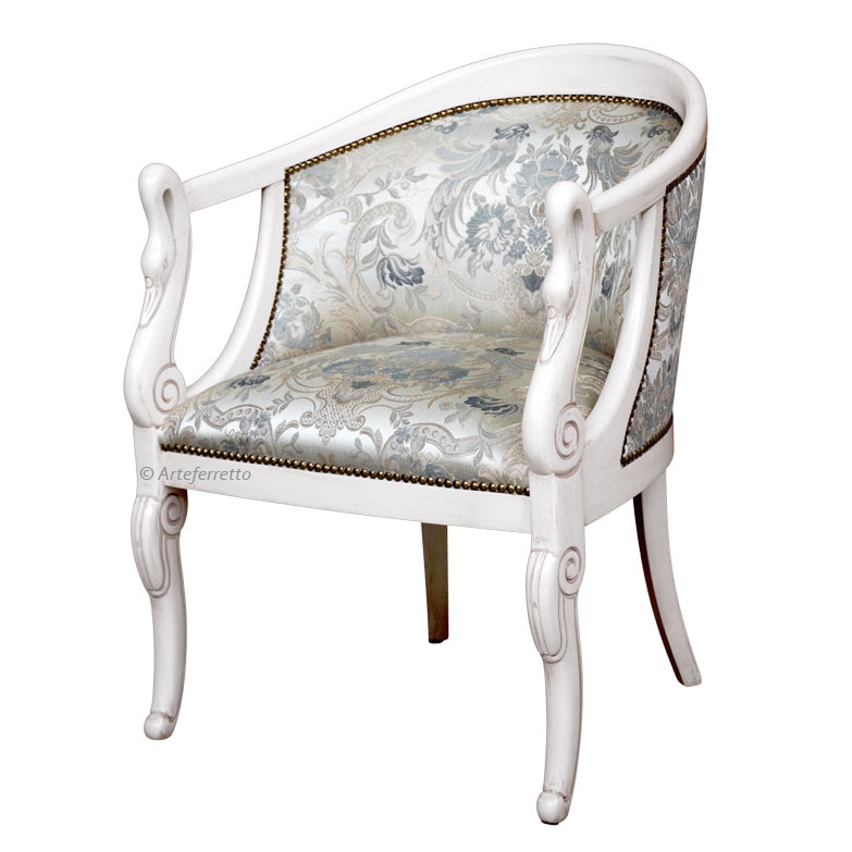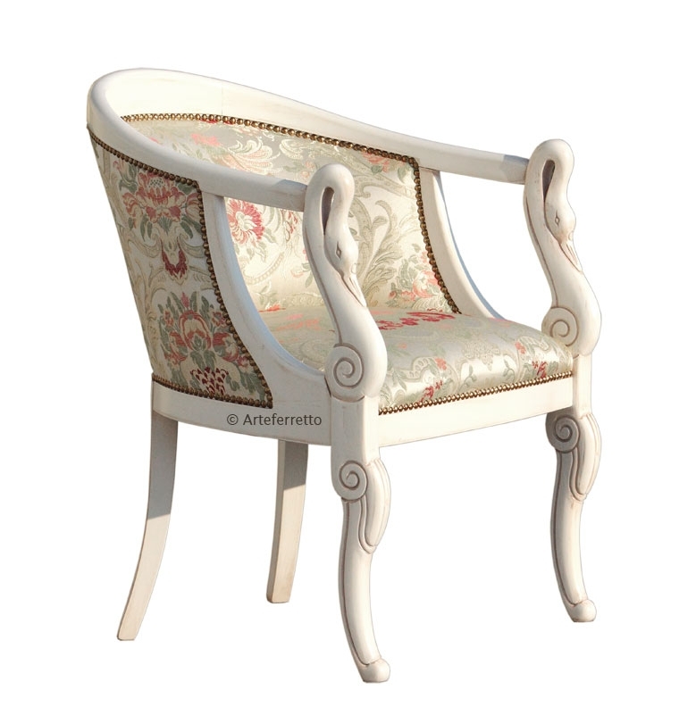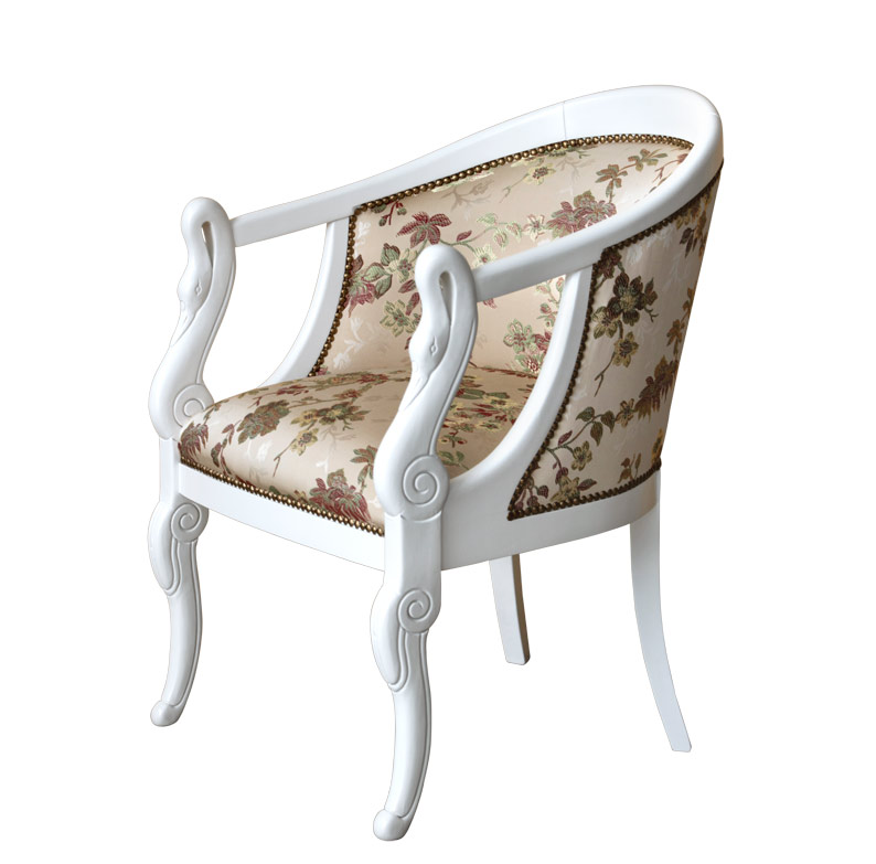 La classicità della sua linea è di una piacevolezza estrema. La parte anteriore, intagliata a collo di cigno, si raccorda con grande eleganza al resto della struttura donando una linea armoniosa all'intera poltroncina.