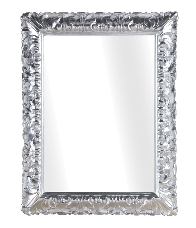 Specchiera classica dalla bella lavorazione con raffinati motivi decorativi che vengono messi in risalto dalla finitura in foglia argento, che dona riflessi particolari alla dolce sagoma della cornice.