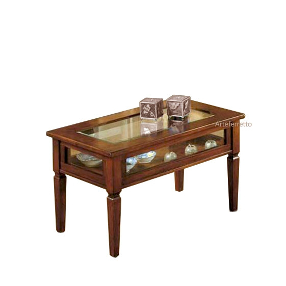 Tavolino a bacheca rettangolare che, con linee classiche e semplici, offre la possibilità di avere un tavolino elegante, con tutte le comodità che un piano d'appoggio in vetro può dare nel contesto di un salotto.