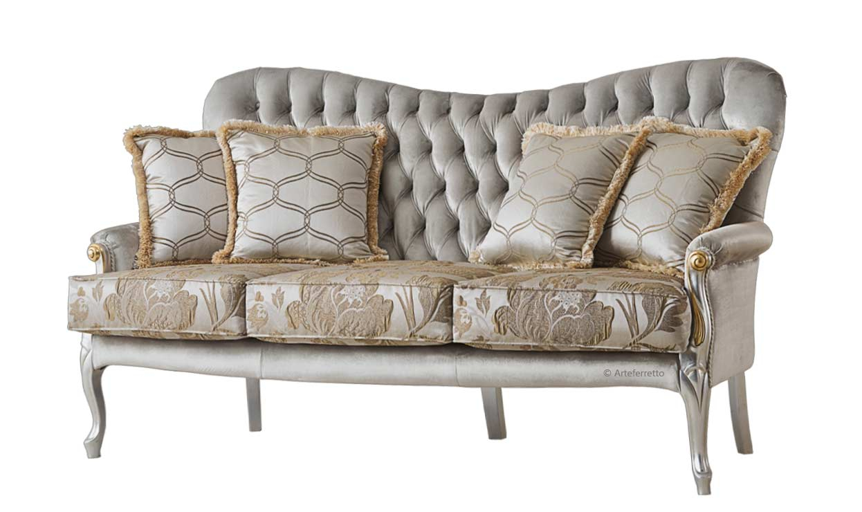 Le spalle lavorate del telaio sono rifinite in foglia argento con dettagli oro per aggiungere valore e bellezza a questo splendido divano.