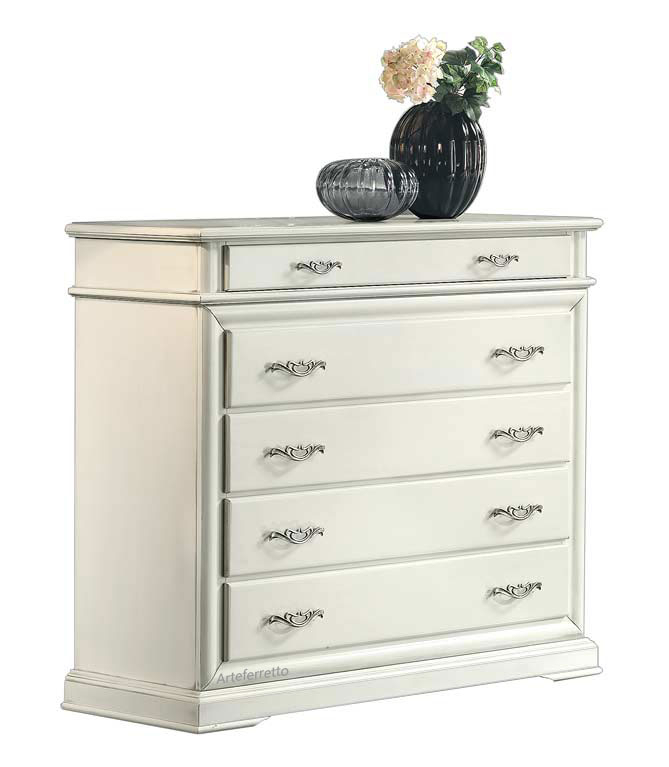 La suddivisione di cassetti di grande capienza dal cassettino più basso, posto appena sotto il top, dona una caratteristica inconfondibile alla sua linea particolare.