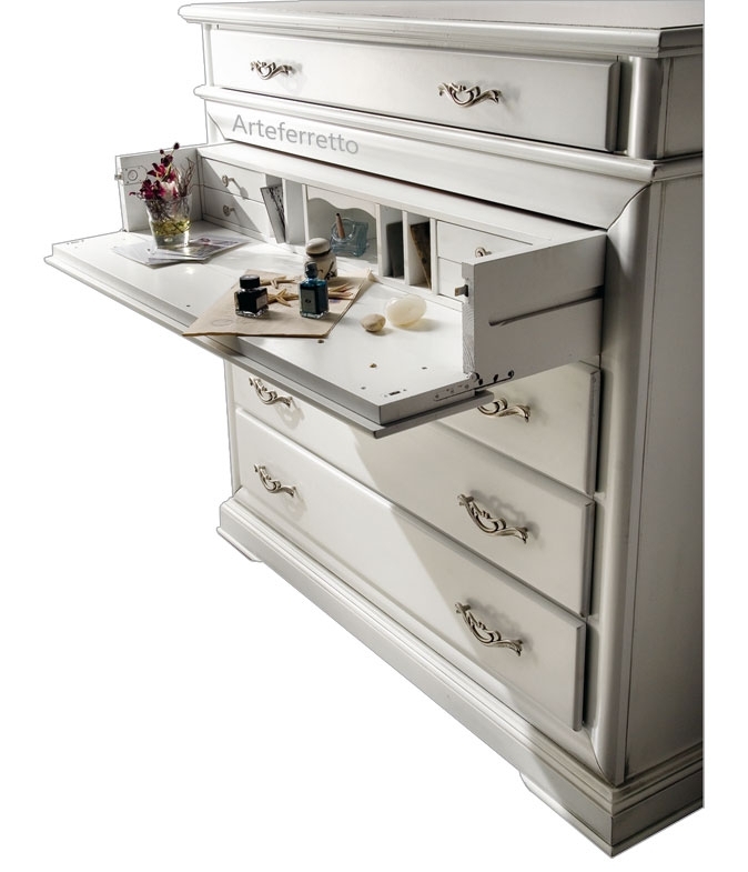 Questo modello dispone di una ribalta in prossimità del cassetto grande più in alto che ne rivela un interno molto accurato e ricco di particolari molto graditi in una camera da letto.