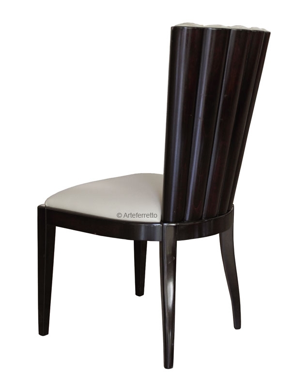 Lo schienale presenta il supporto retrostante in legno di faggio e la parte anteriore è imbottita simmetricamente con delicato lavoro di tappezzeria artigianale.