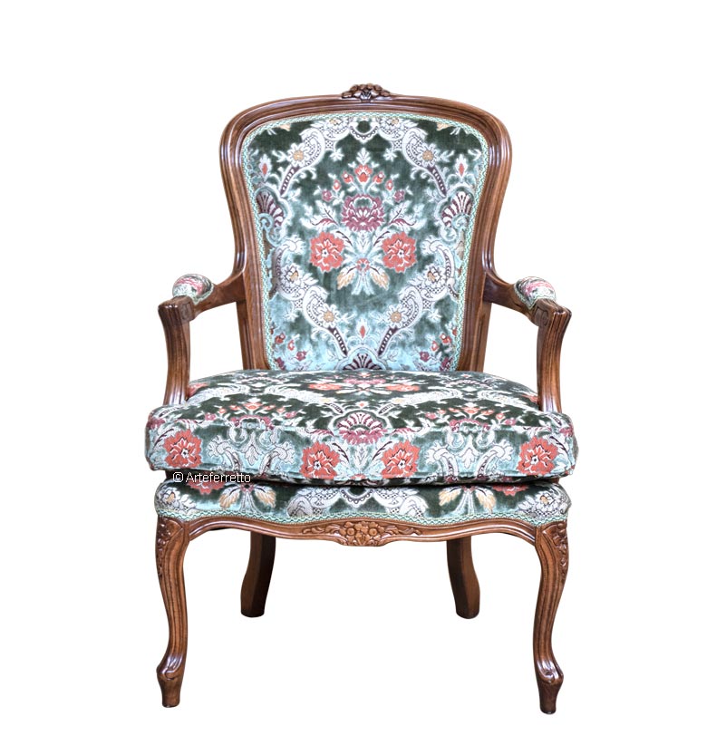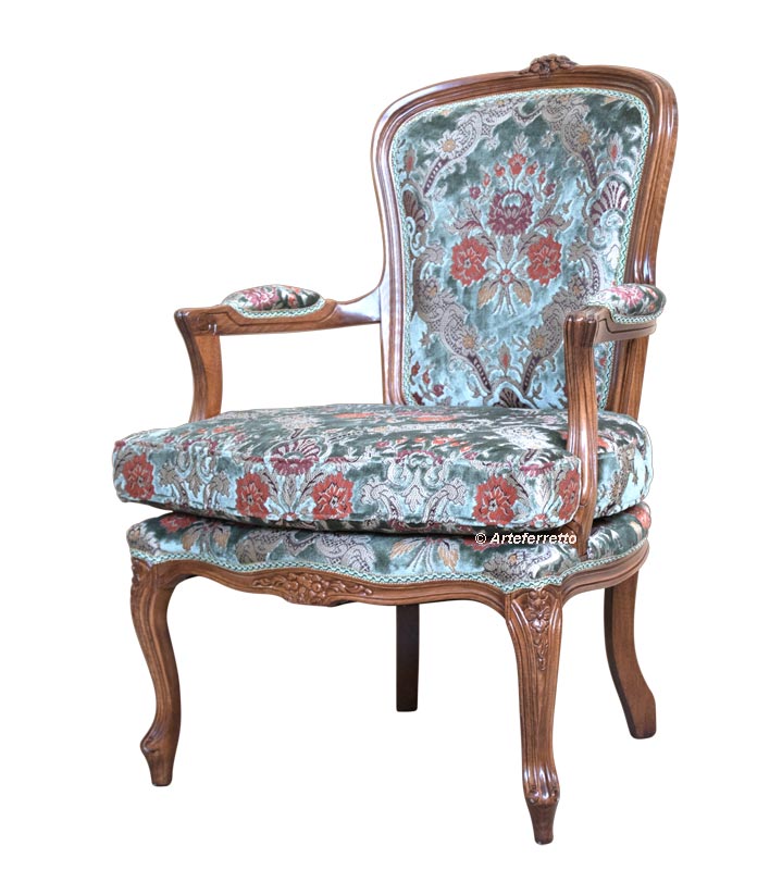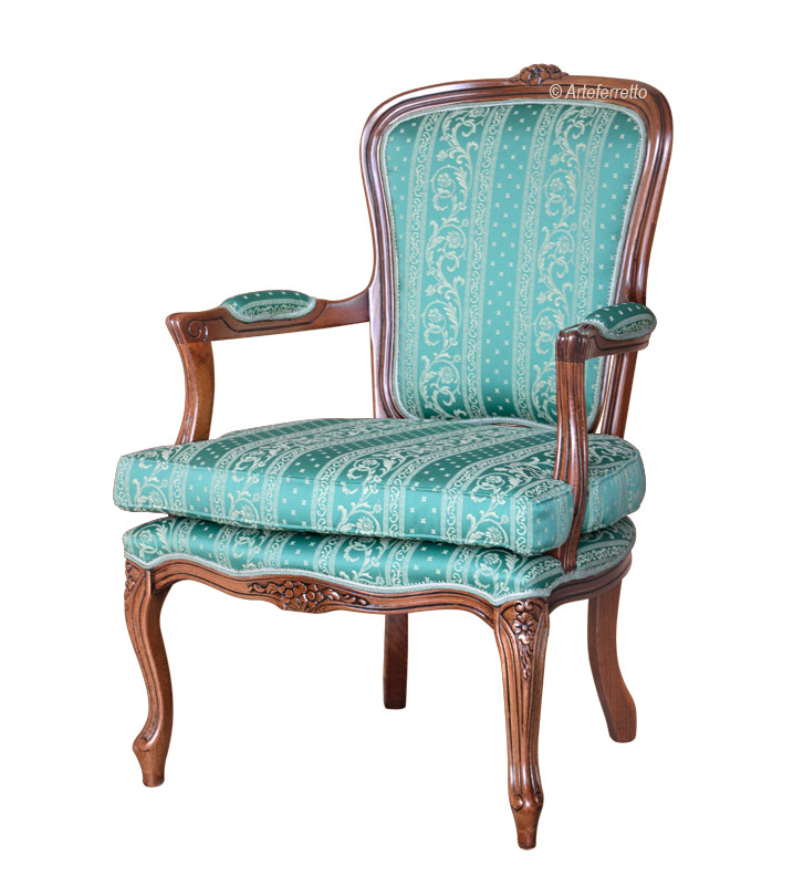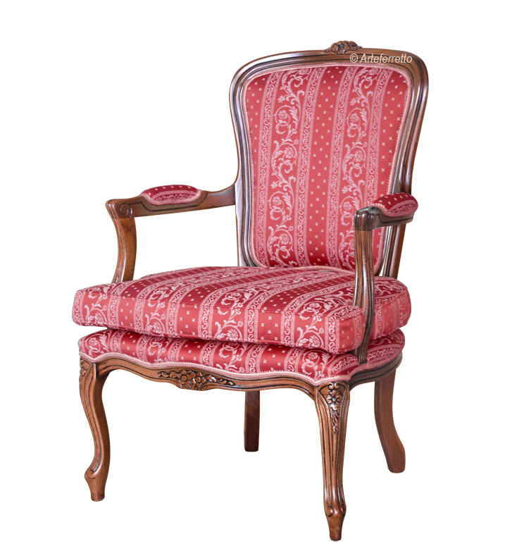Poltrona stile Luigi XV che coniuga una linea slanciata e classica ad un'ottima comodità di seduta.