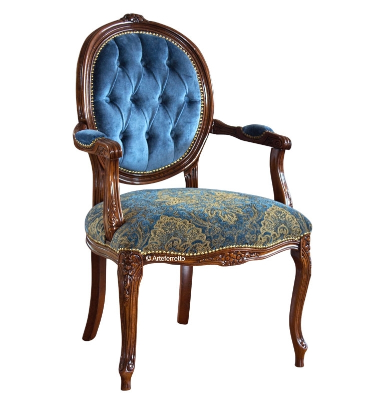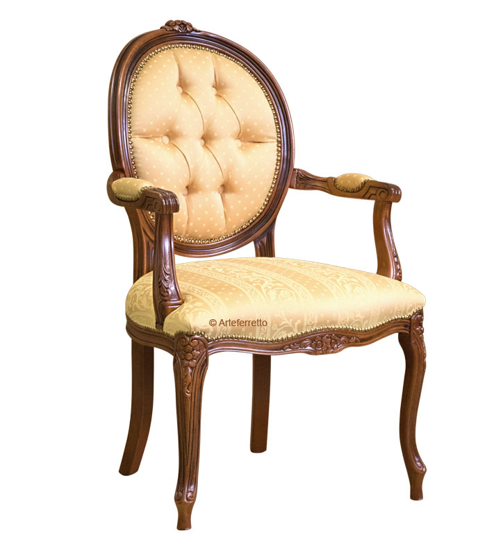 Poltroncina schienale ovale in stile classico creata e tappezzata a mano da artigiani veneti.