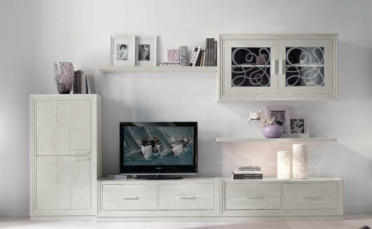 Questa composizione per parete soggiorno ha la vetrina pensile laterale decorata da giocosi motivi arzigogolati che donano brio all'ambiente; allo stesso modo le due ante del mobile verticale a terra sono formate da listelli di legno, incastrati tra di loro, che non combaciano.