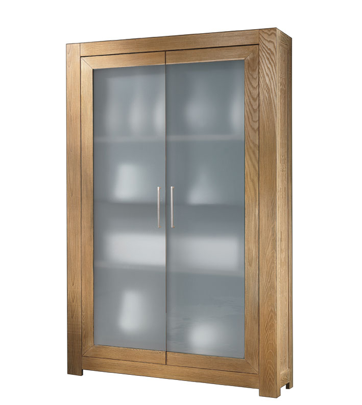 Vetrina frassino raffinata e rifinito naturale a poro aperto, con ante in vetro satinato.