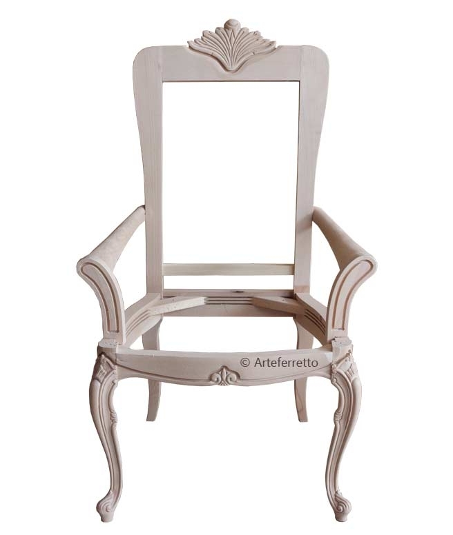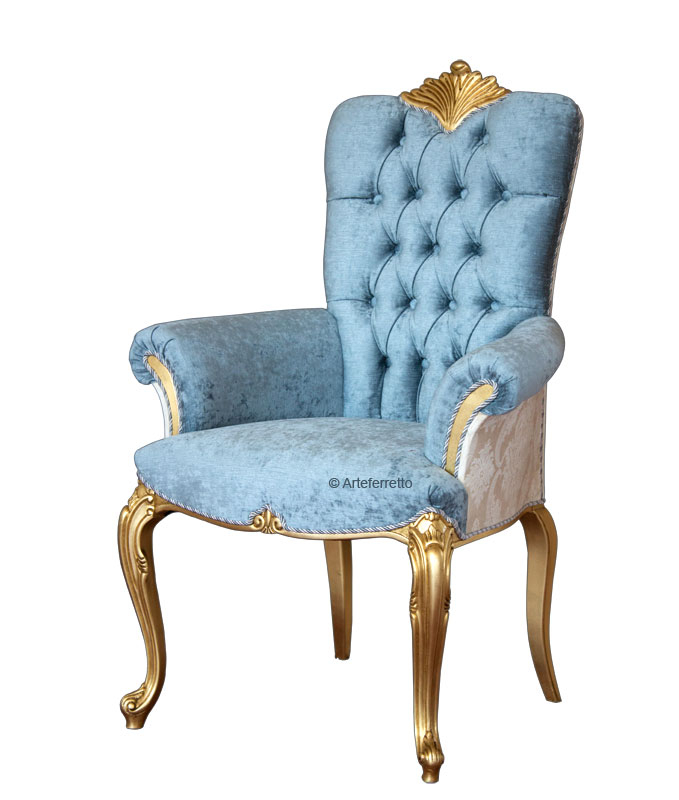 La classicità della seduta e dello schienale valorizzato da uno strepitoso capitonné viene risaltata da un tessuto che dona valore e bellezza ad ogni curva ed ogni piega della parte tappezzata. La splendida crestina in legno intagliato che si erge al centro dello schienale è qualcosa di veramente unico! Esternamente e sulla parte posteriore uno splendido tessuto damascato dona vivacità ed allegria ad un articolo di grande eleganza.