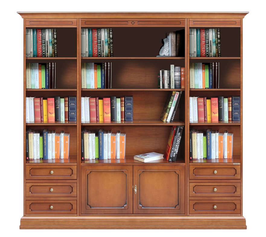 In questa libreria da parete lateralmente, nella parte inferiore, 6 comodi cassetti offrono grande utilità e centralmente si potrà fruire di un utile spazio racchiuso da due belle antine.