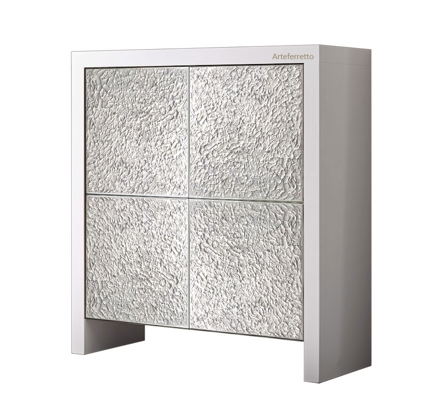 Mobile credenza alto di stile moderno con 4 ante in legno e decorazione silver a rilievo.