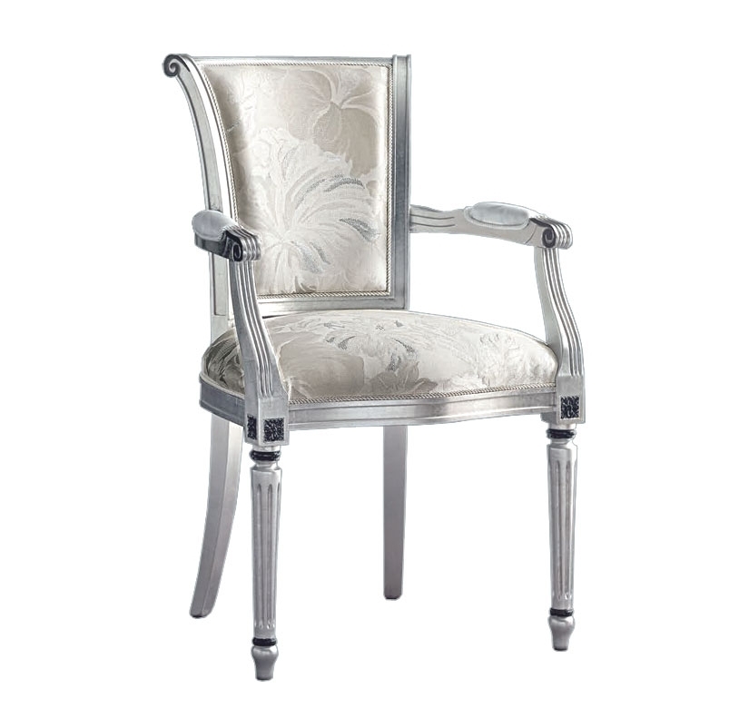 Il solido telaio in legno di faggio è rifinito in foglia argento con particolari evidenziati in nero. Le accurate lavorazioni si esaltano in una luminosa e raffinata struttura, impreziosita da una comoda imbottitura.