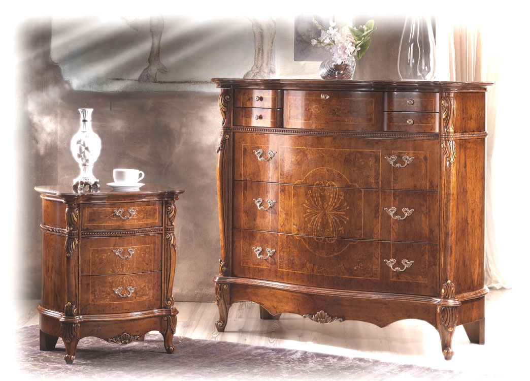 In questo comodino stile classico, gli intagli, finemente incavati lungo i profili del comodino, accompagnano l'eleganza della linea che viene esaltata da meravigliosi intarsi realizzati da diverse essenze di legno.