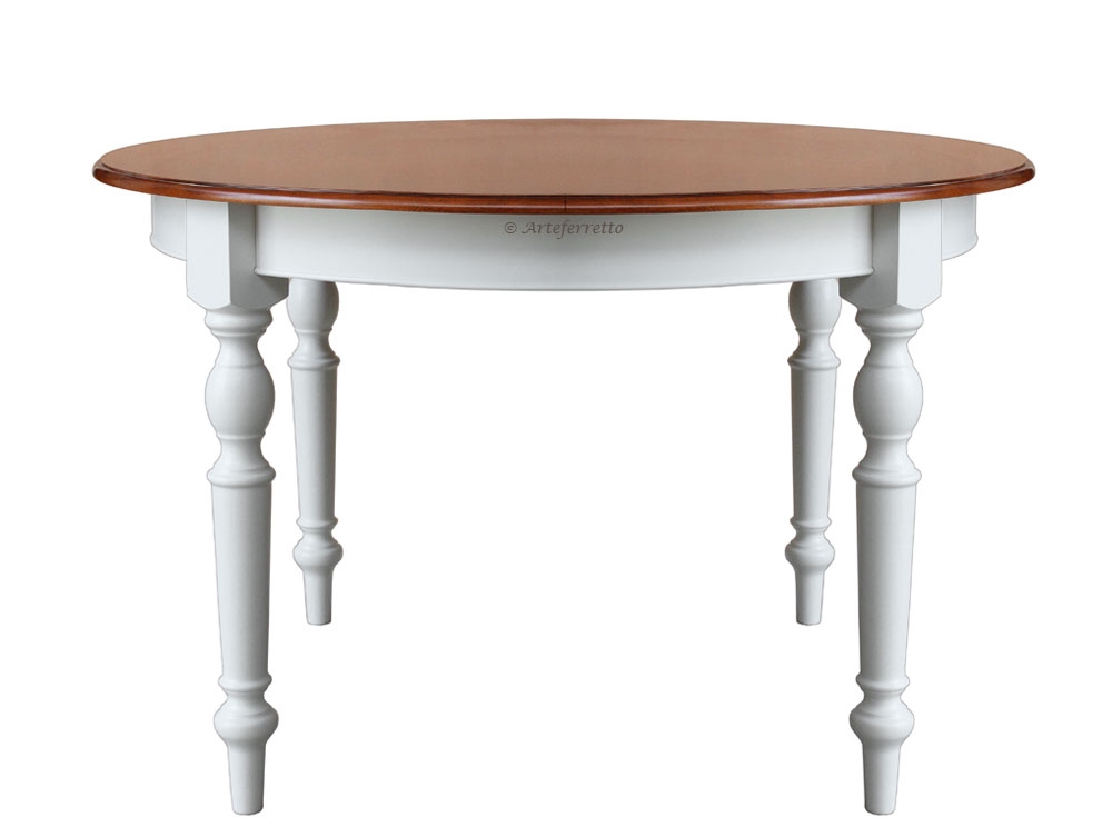 La freschezza della laccatura e il pregio di un piano in tinta naturale costituiscono per questo tavolo rotondo bicolore un abbinamento di grande gusto.