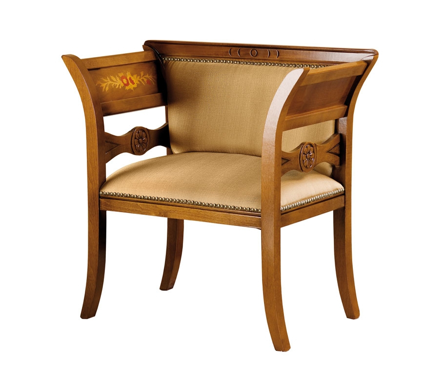 Graziosa panchetta in legno di faggio dalla linea semplice e dolce valorizzata da discreti intarsi sulla struttura laterale.