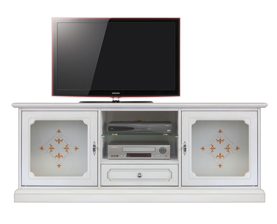 Mobile tv vetri decorati con vano centrale, 2 ante in vetro decorato e 1 cassetto.