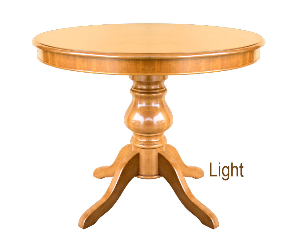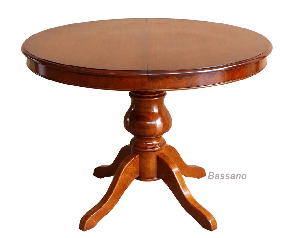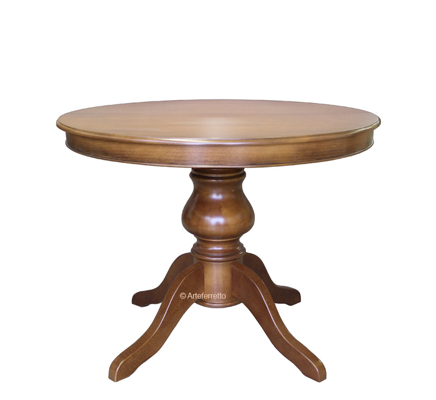 Tavolo rotondo classico con gambone centrale, presenta una struttura decisamente solida e stabile. Particolarmente adatto ad ambienti di contenute dimensioni, grazie all'allunga integrata al piano ed estraibile all'occorrenza, questo tavolo potrà fornire una superficie del piano più ampia.