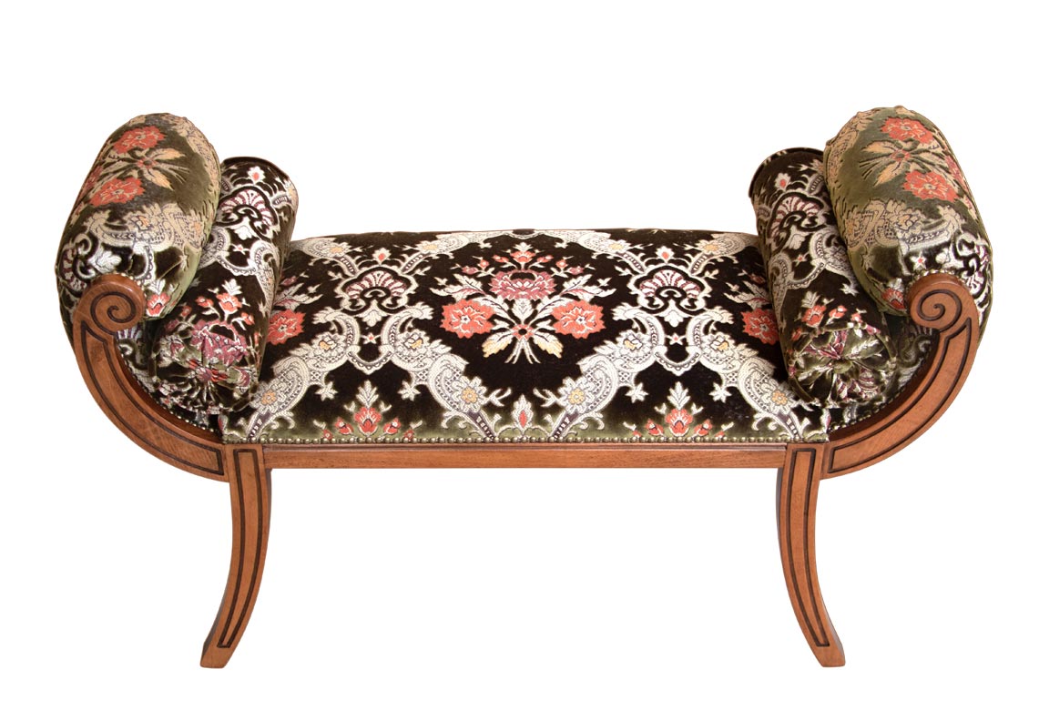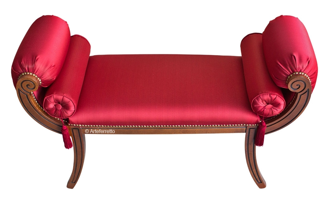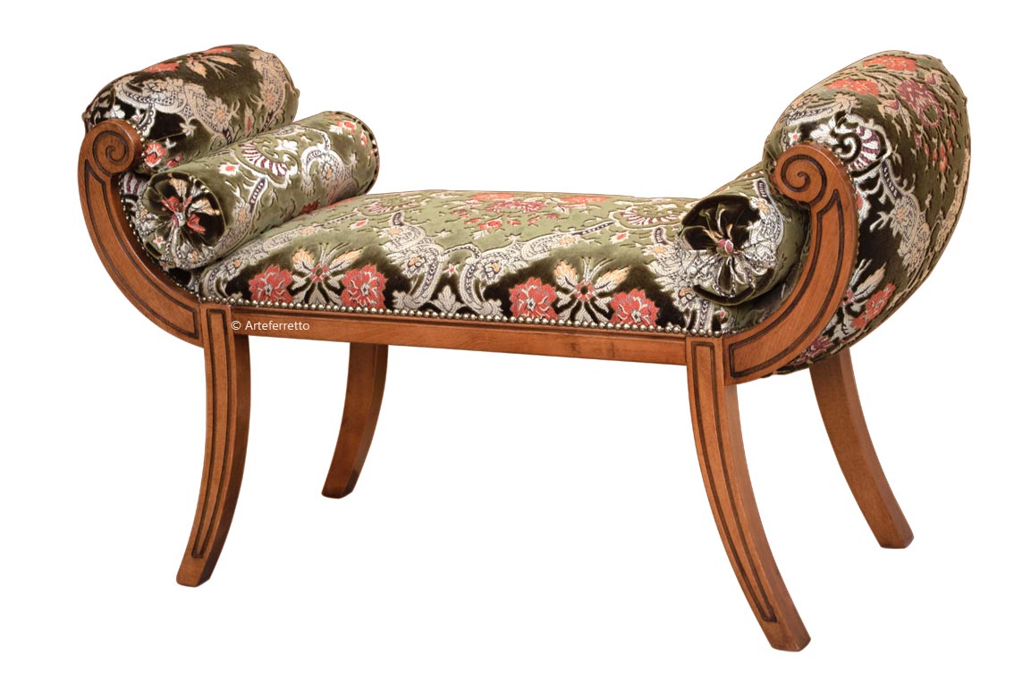 Una struttura in faggio massello addolcita da dolci curvature accompagna la delicata finitura della tappezzeria dove il gioco di curve lascia spazio a graziosi e stilizzati cuscini a cilindro di grande fascino.
