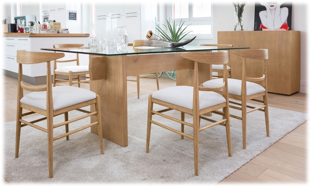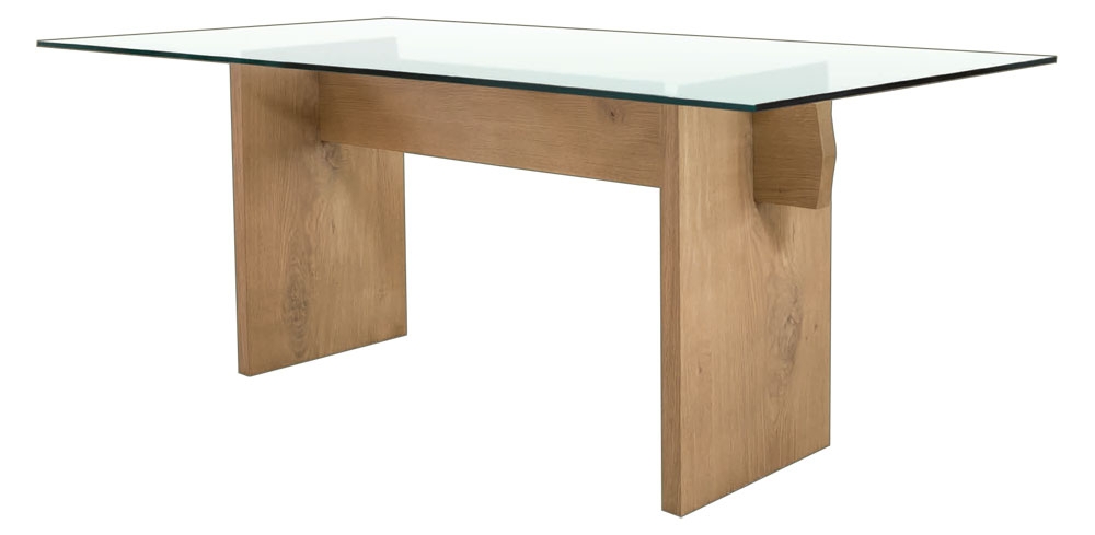 Tavolo rovere ricco di fascino per un ambiente fresco e luminoso. La possente struttura in legno massello di rovere costituisce una base solida ed originale per il bel piano in cristallo temperato.