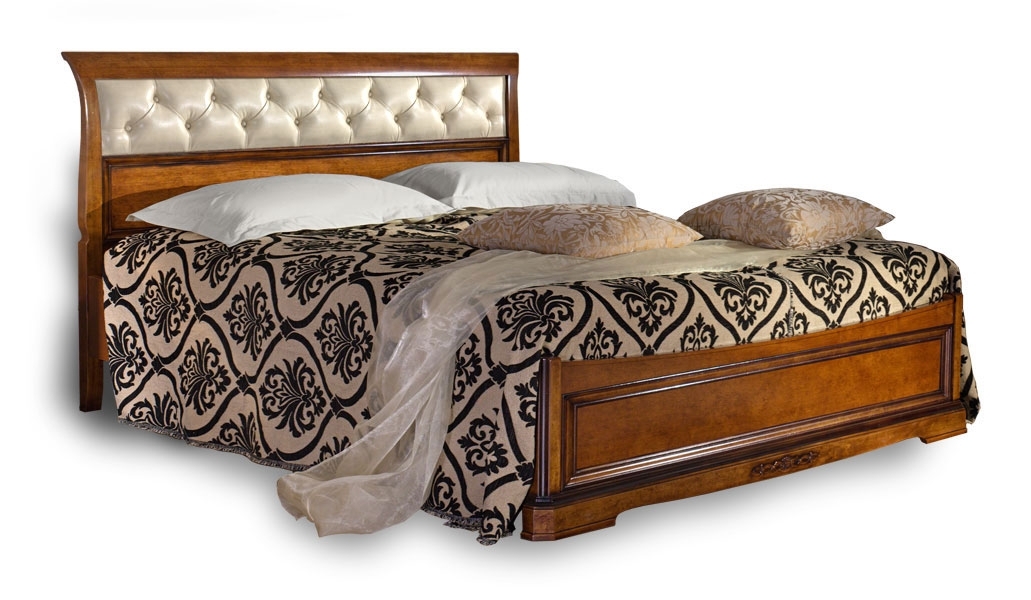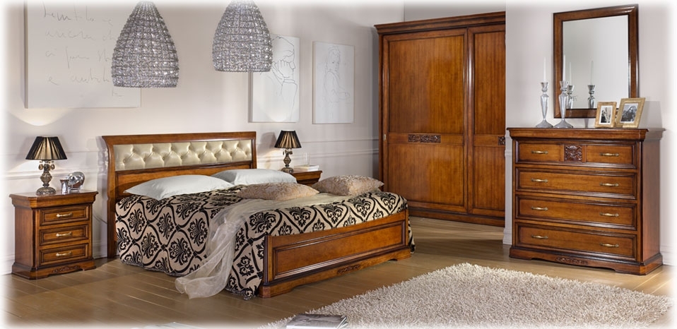 Letto matrimoniale di grande equilibrio stilistico che associa al pregio del legno naturale, lavorato con grande attenzione da esperti artigiani, una testata che dona morbidezza alla linea e grande eleganza alla robusta struttura.