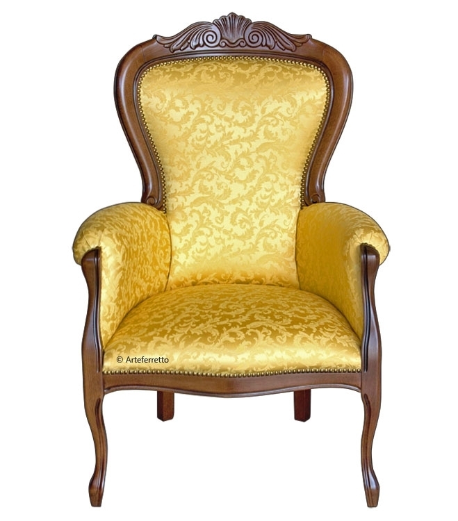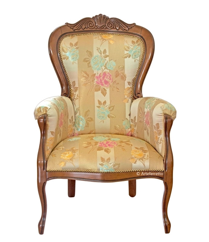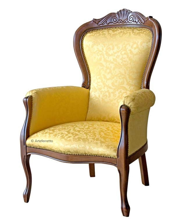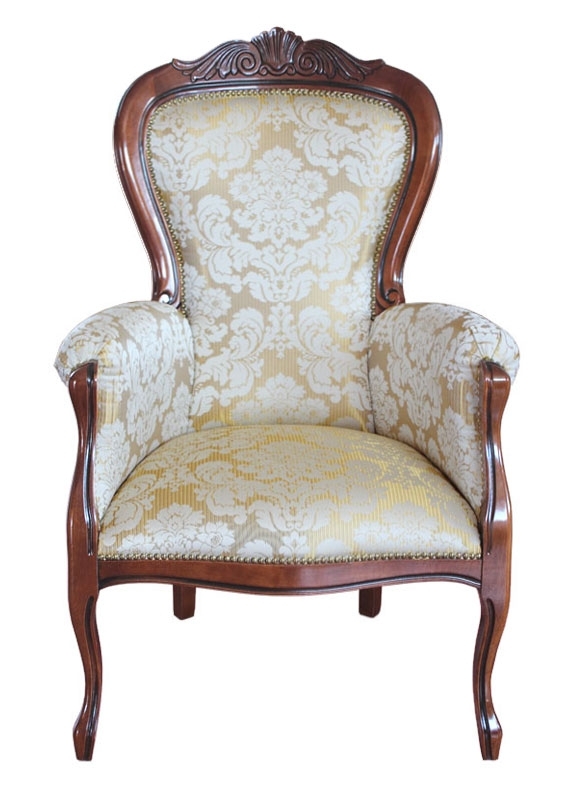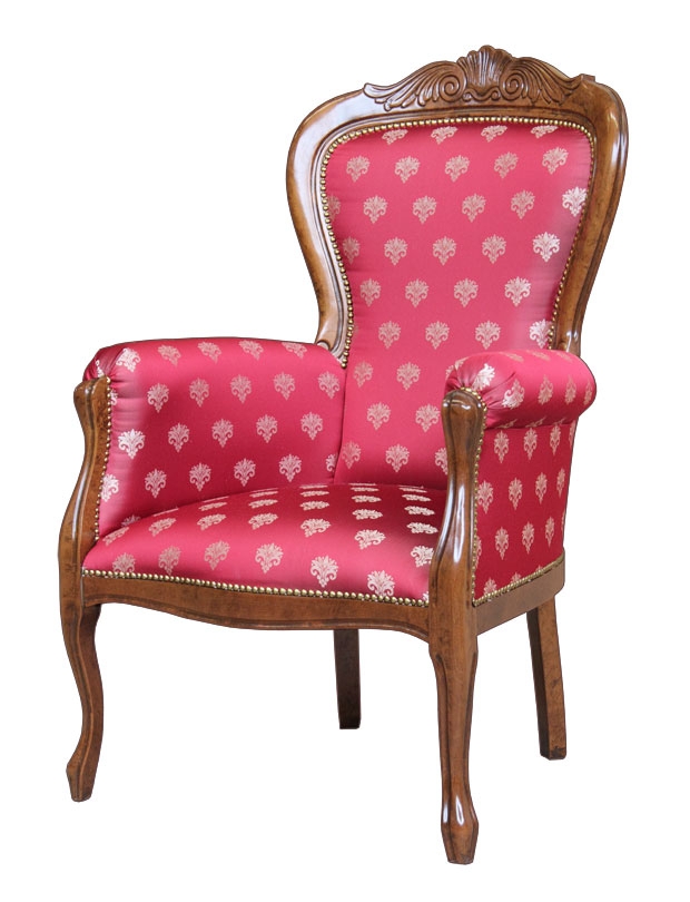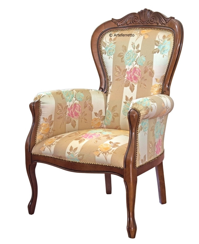 Comoda poltrona stilizzata con solido telaio in legno massello di faggio caratterizzata da un pregiato intaglio nella parte superiore.
