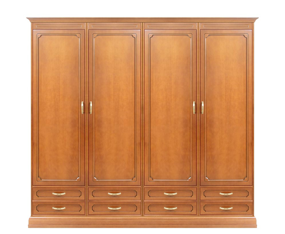 Le quattro ante, allestite internamente con solidi ripiani e con paletti per appendiabiti, offriranno spazio e custodiranno il guardaroba; i capienti cassetti, ben otto, daranno una grande mano a tenere tutto perfettamente in ordine.