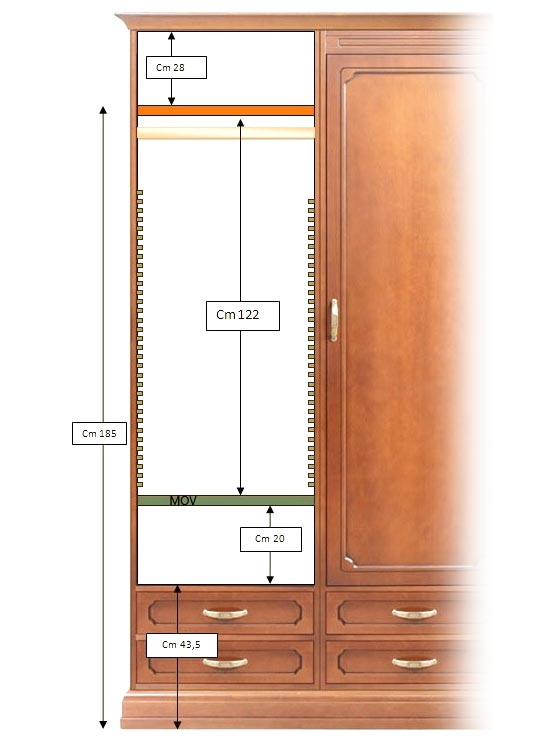La dotazione interna standard di ogni modulo prevede un paletto appendiabiti e un ripiano regolabile in altezza (oltre a quello fisso appena sopra il paletto).