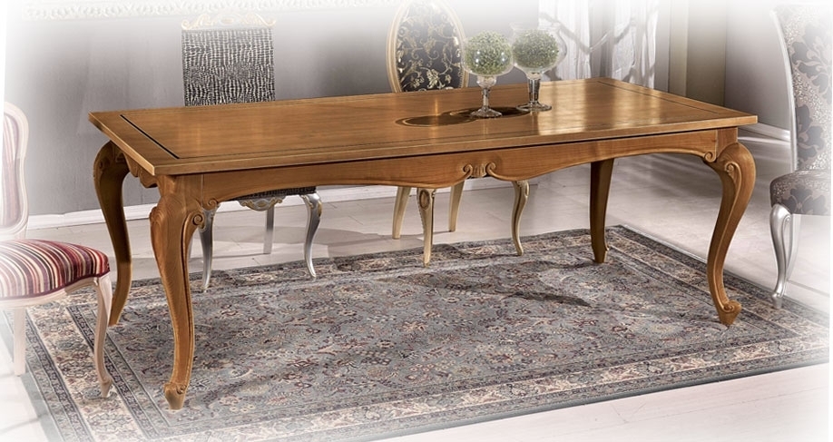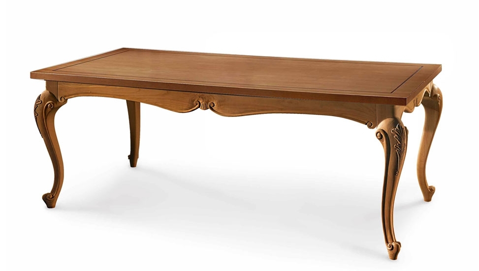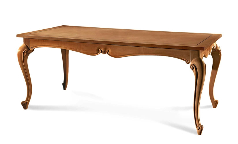 Splendido esempio di artigianato Made in Italy: forme ampie e sinuose caratterizzano questo tavolo rettangolare spazioso ed estremamente curato nei minimi dettagli. La piacevole sagomatura del bordo, caratterizzato da riccioli intagliati, è ripresa anche nella forma stilizzata delle solide gambe.